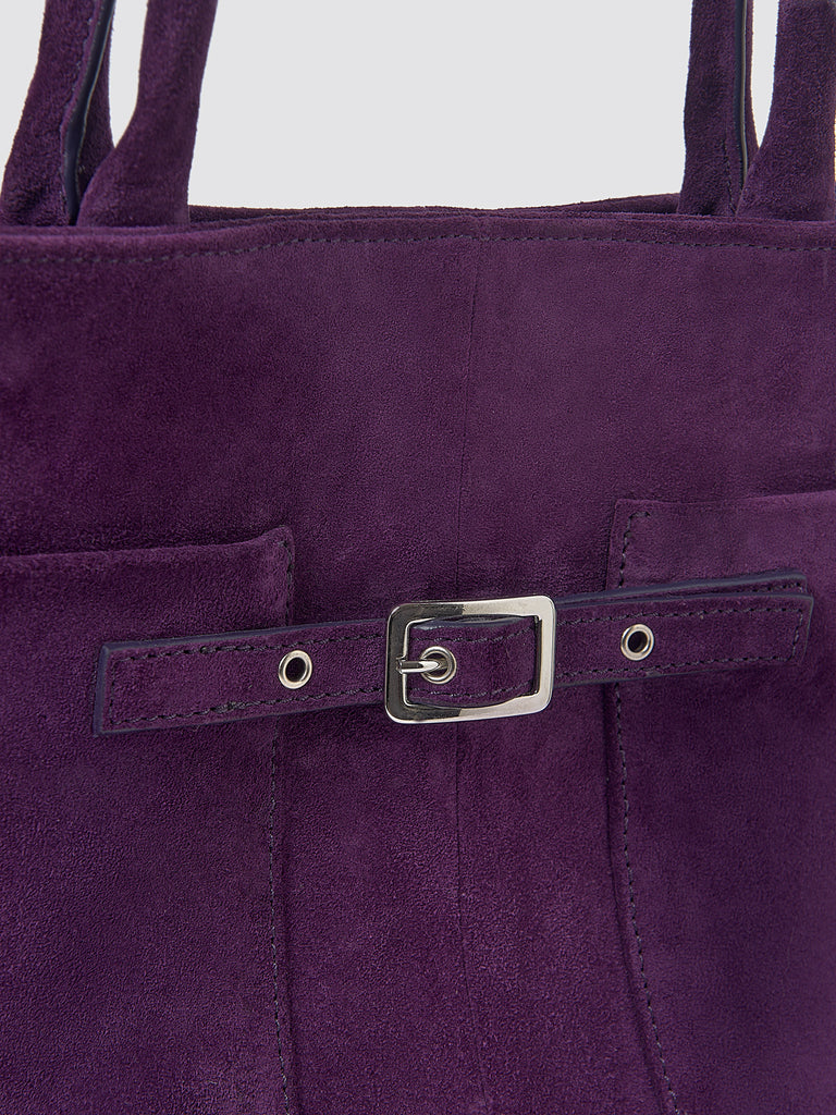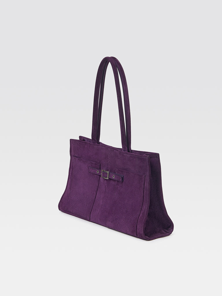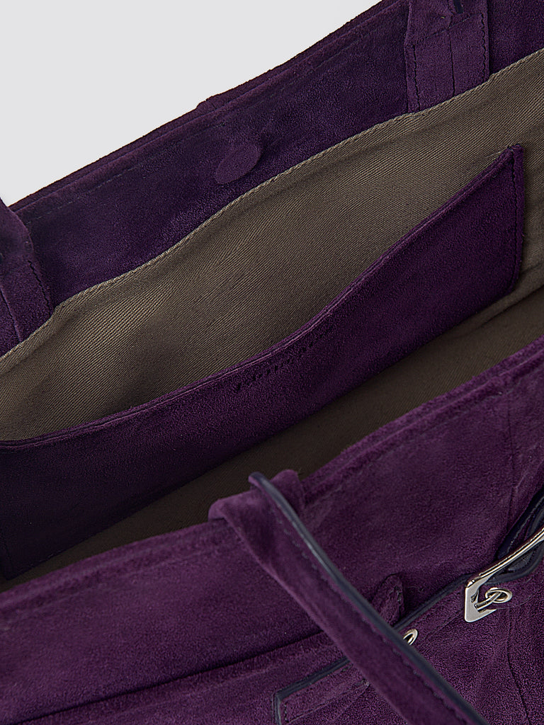 Aubergine women's suede tote bag featuring dual handles crafted from matching suede.