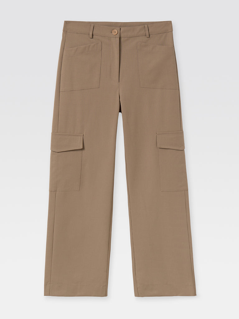 Camel low-rise women's cargo trousers crafted for a relaxed, loose fit. Designed with functional patch pockets on the sides and at the waistband. Features a button and zip closure at the front.