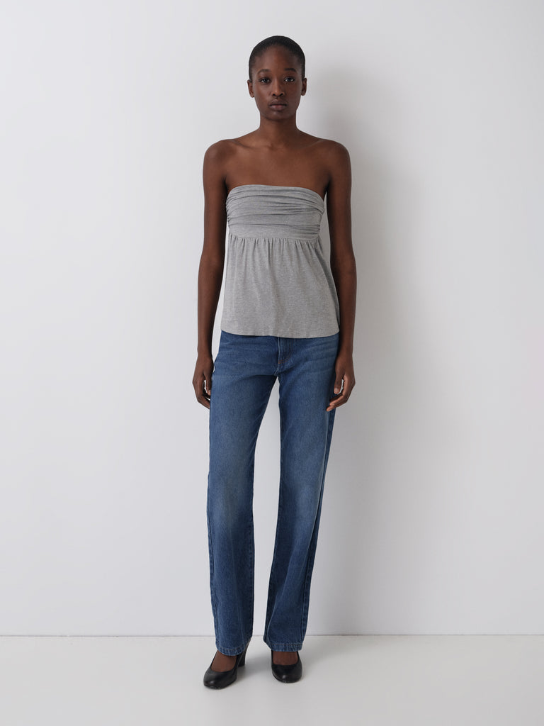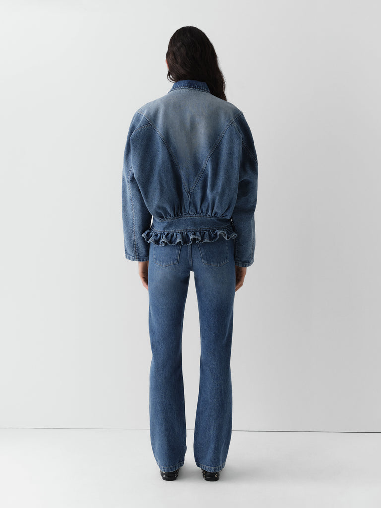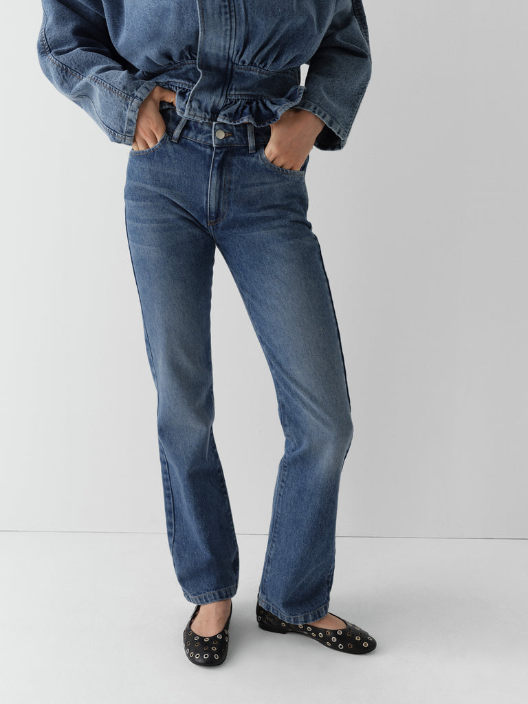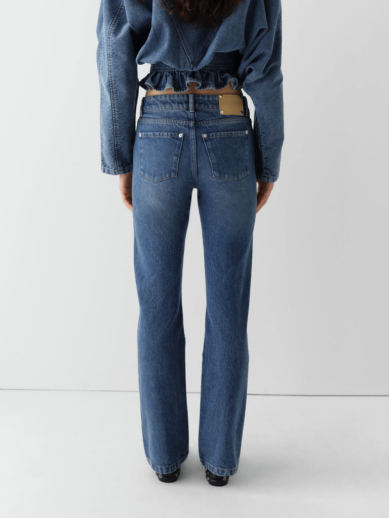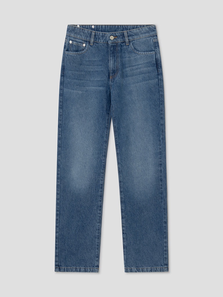 Blue washed denim trousers with straight cut and mid-rise waist.