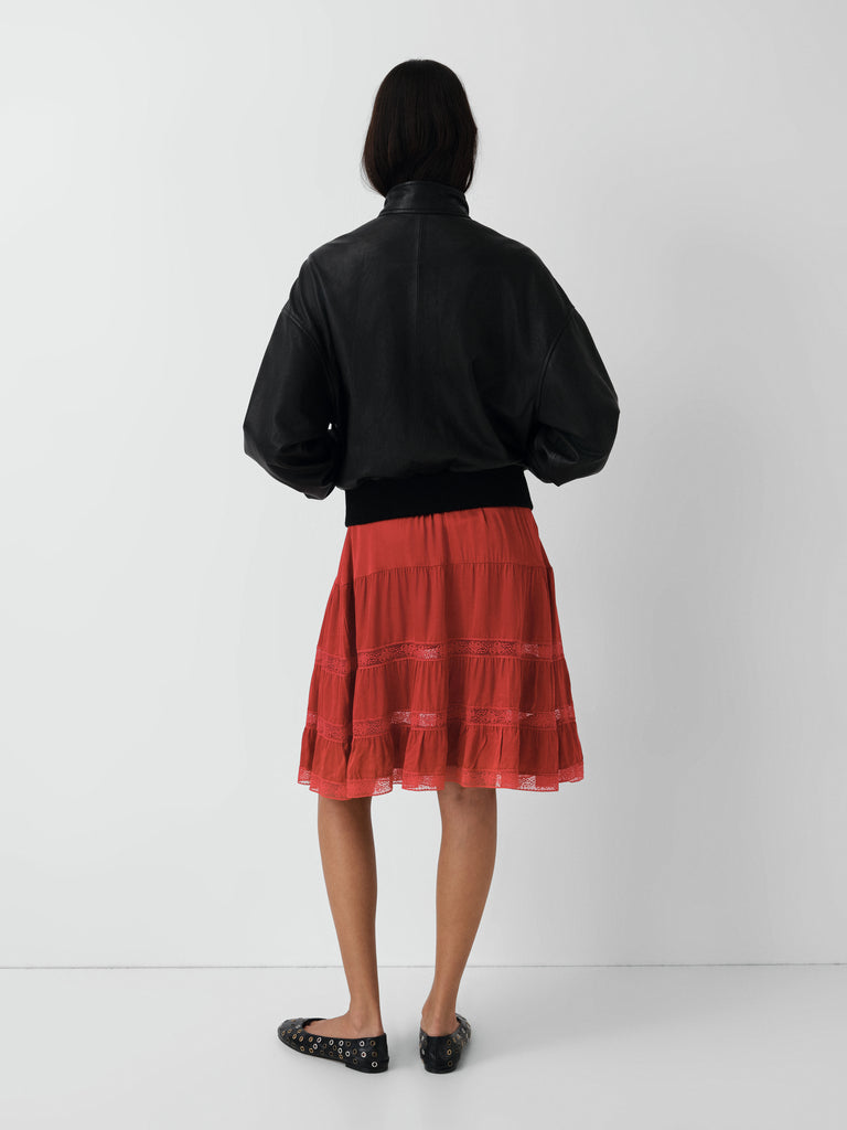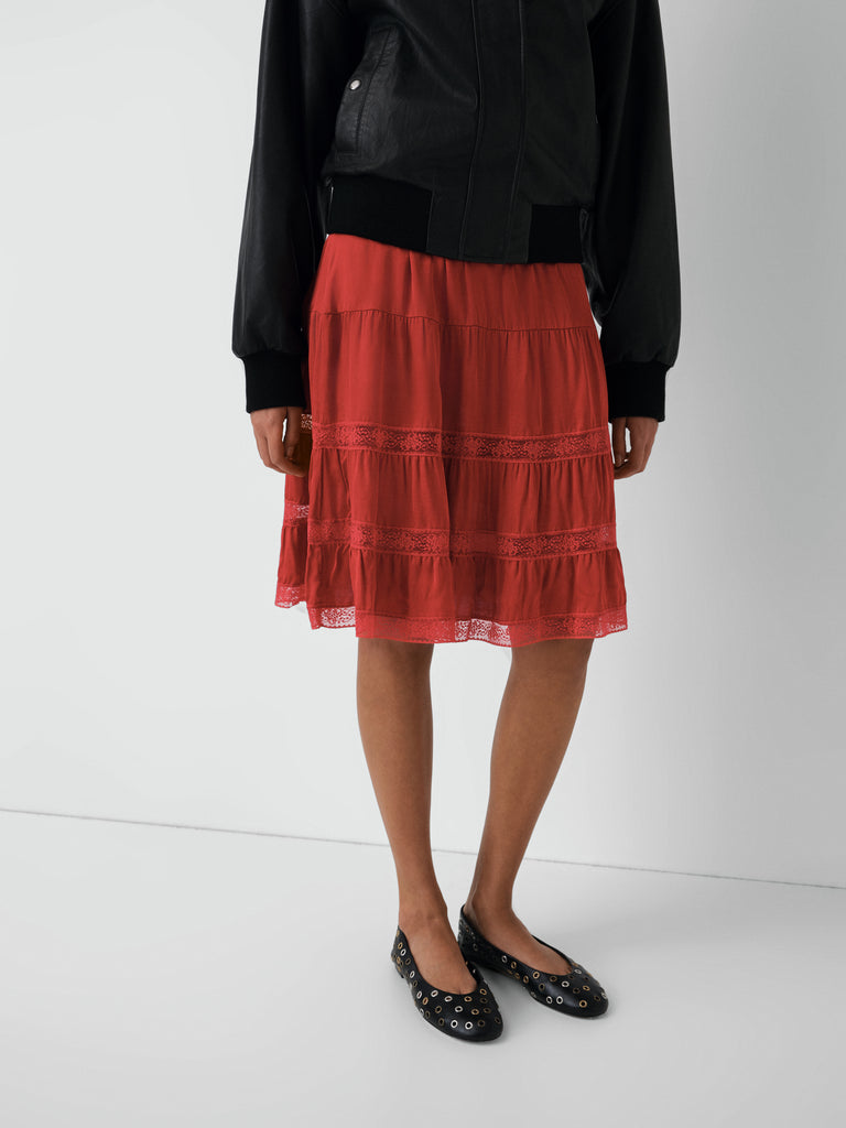 Structured red midi skirt with lace-trimmed panels.