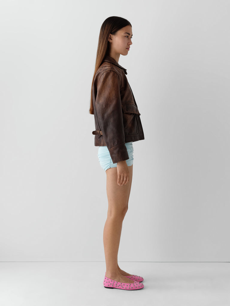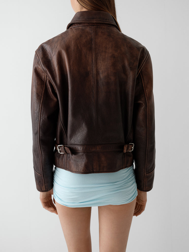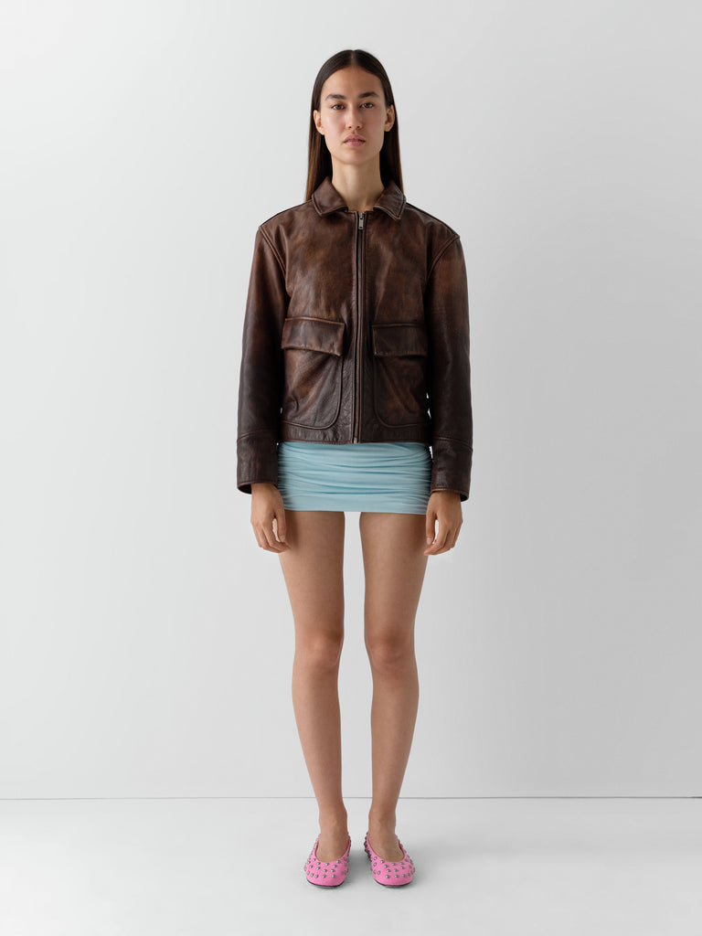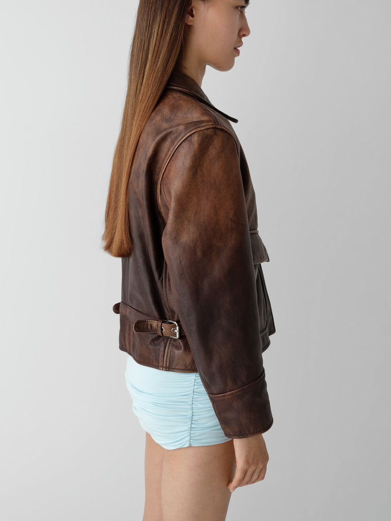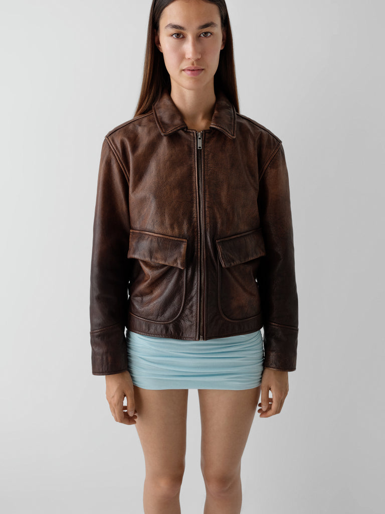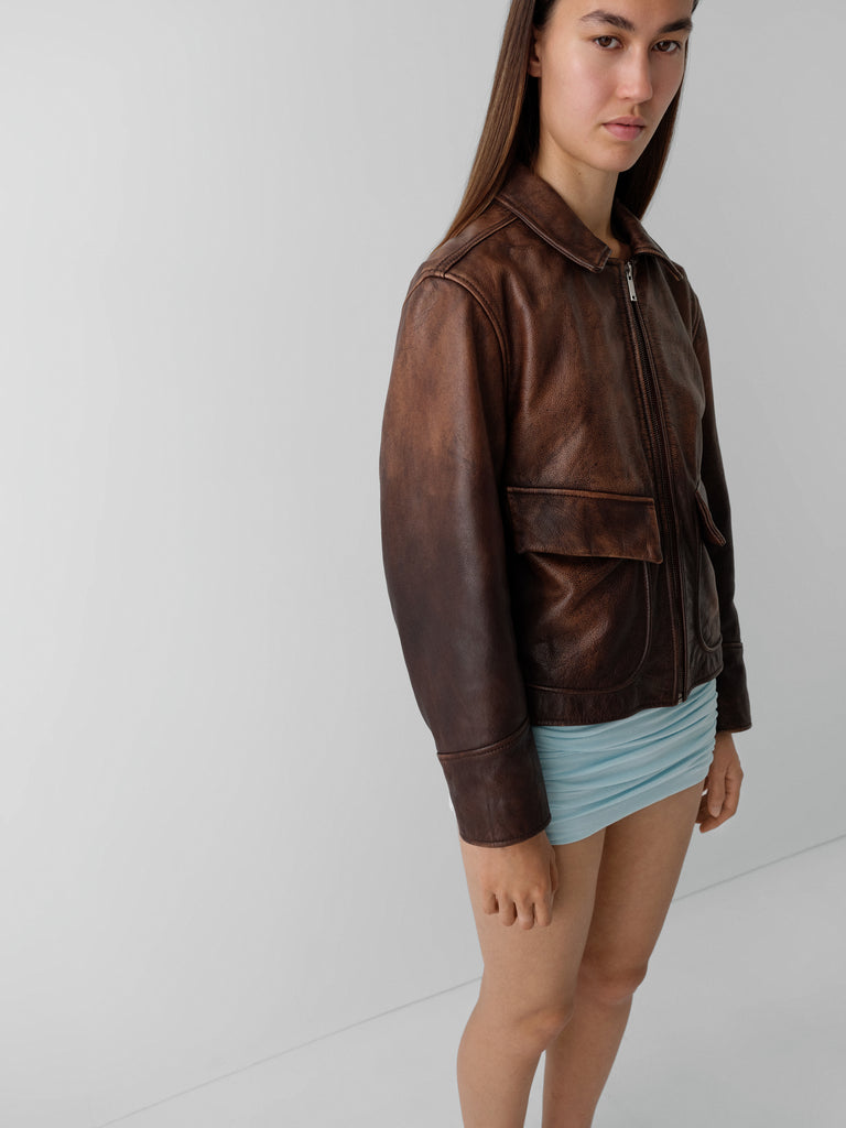 Brown faded leather jacket with flap pockets and zip closure.