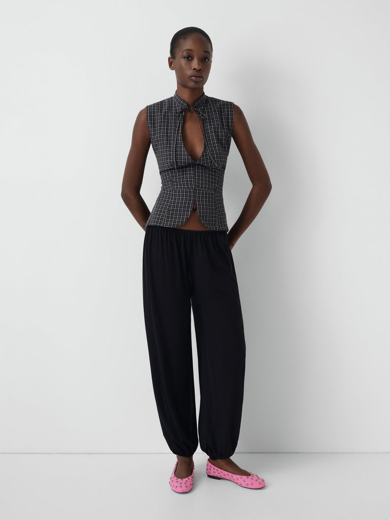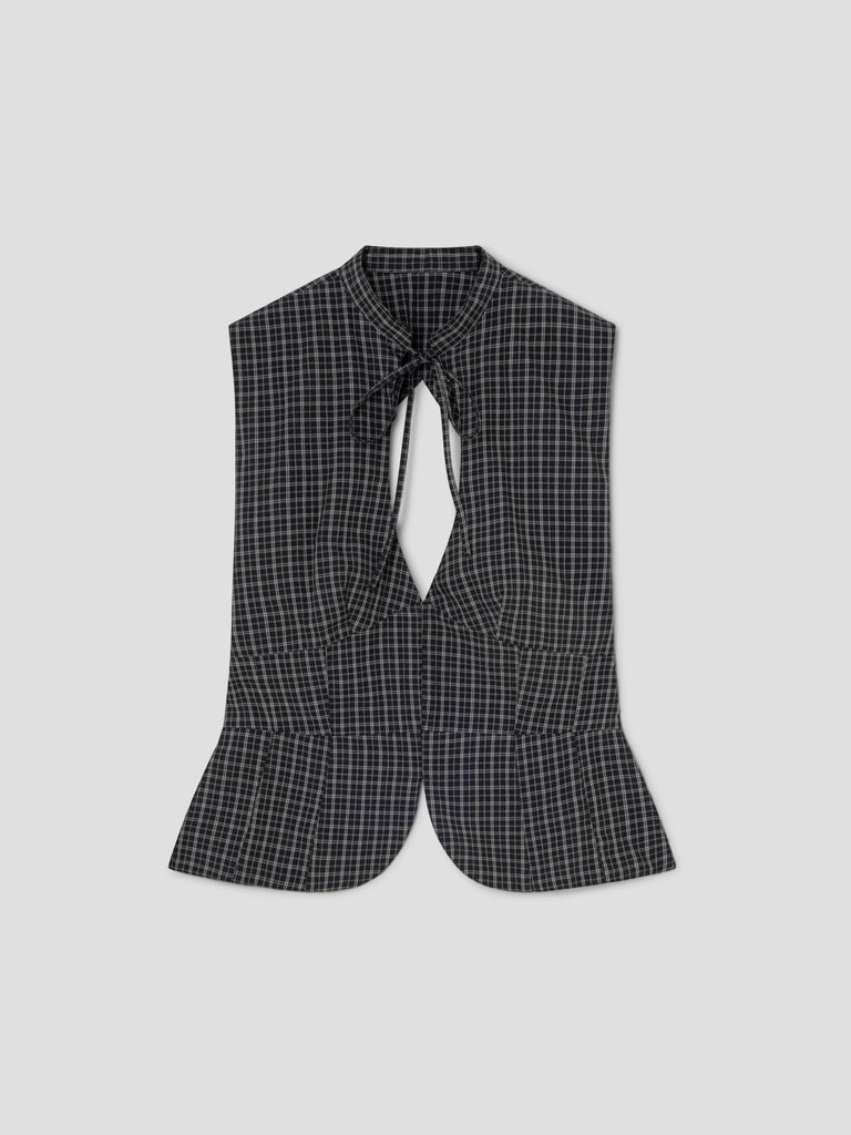 Checkered top in black and grey with front cut-out and open back.