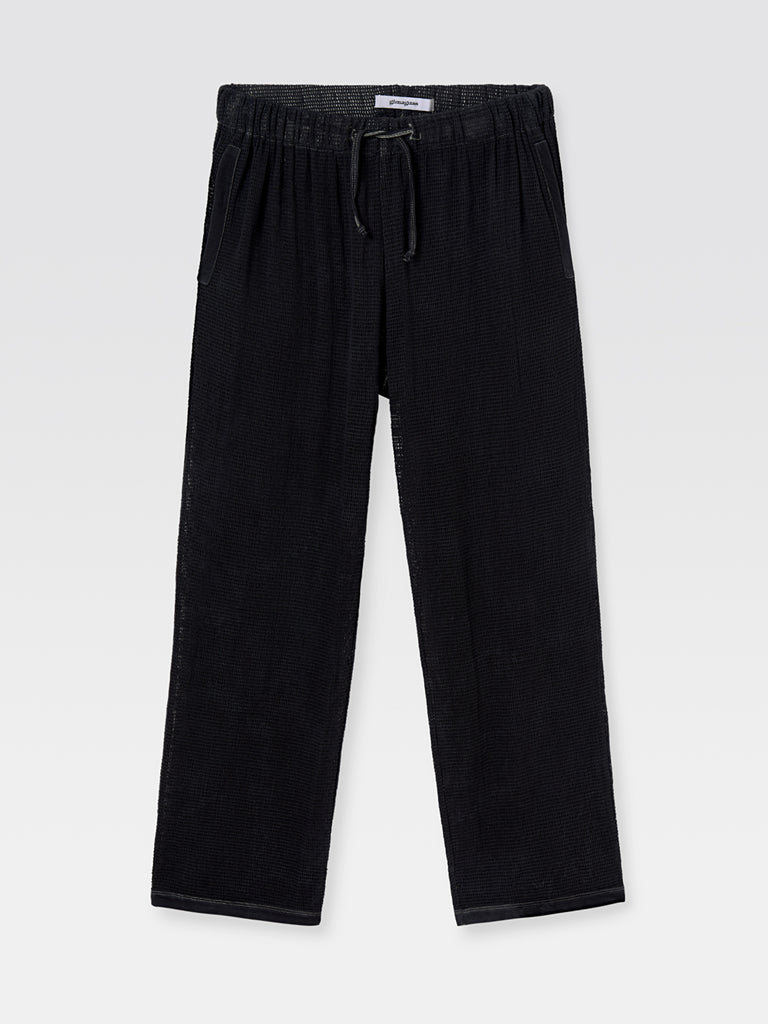 Black tricot cotton see through pants cut to a relaxed fit with side pockets and adjustable drawstring.