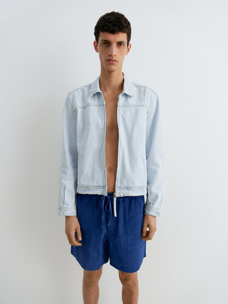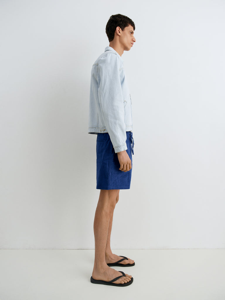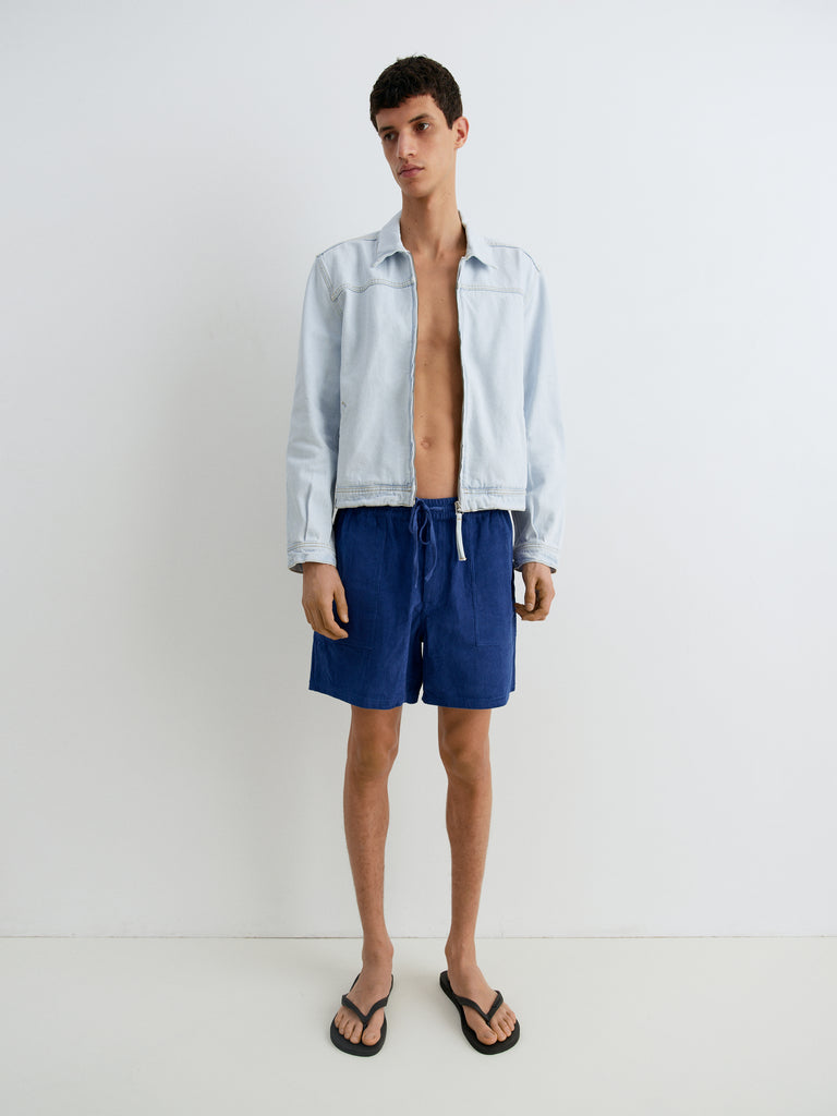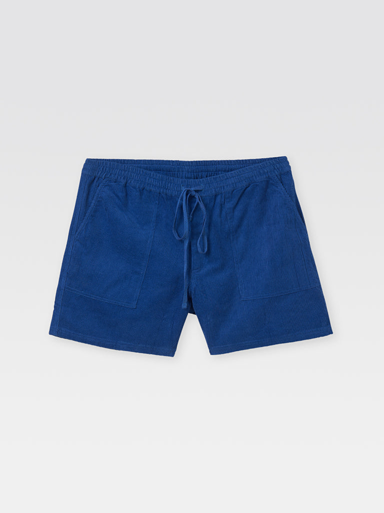 Blue shorts featuring a wide-leg fit and a soft corduroy texture. Detailed with an elasticated waistband and adjustable drawstring. Side patch pockets add a functional touch to the relaxed silhouette.