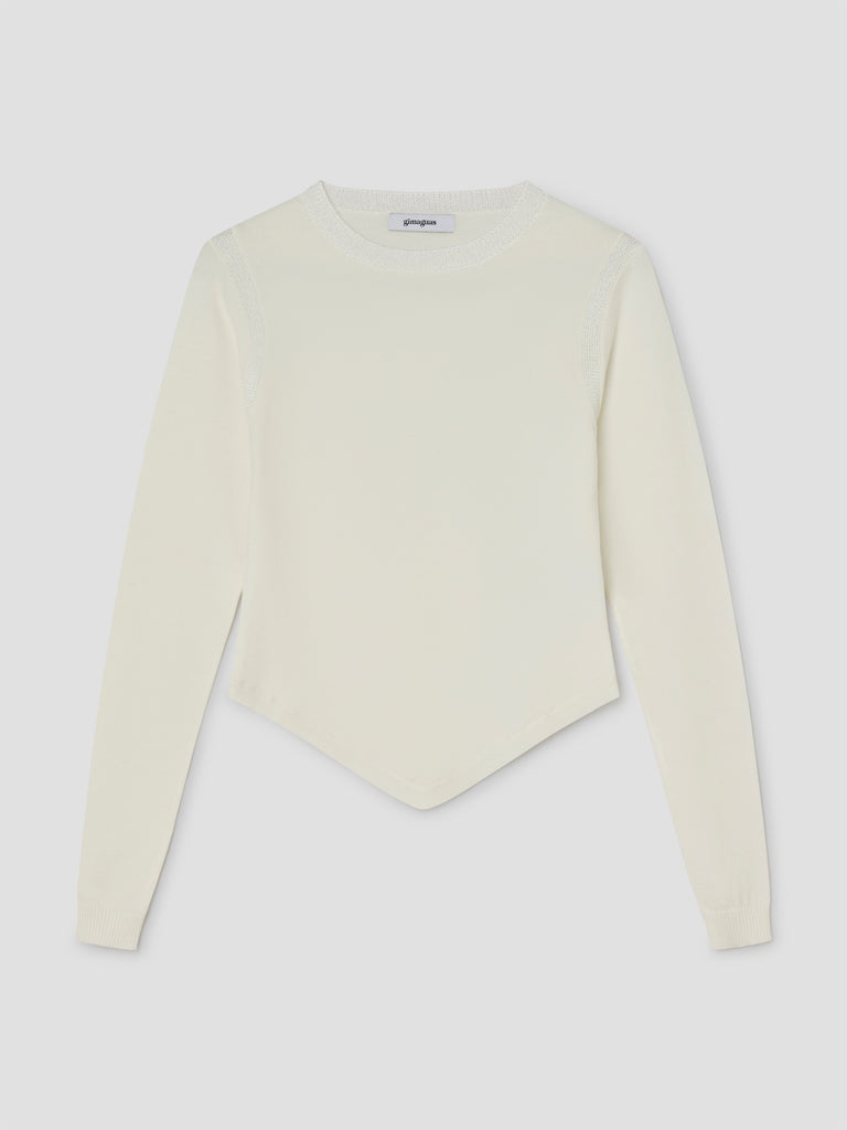 Long-sleeved t-shirt with irregular triangle shape hem in white.