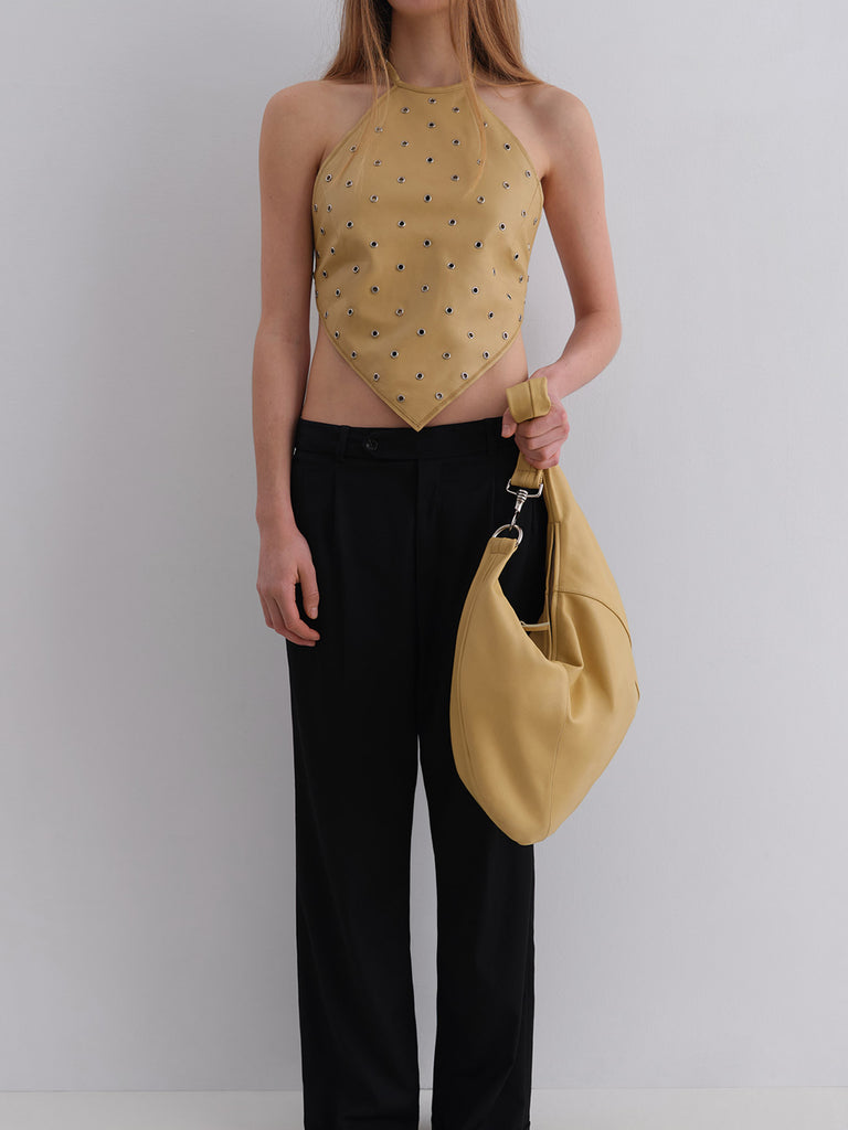 Butter yellow leather top with a triangular silhouette and metal eyelet detailing.