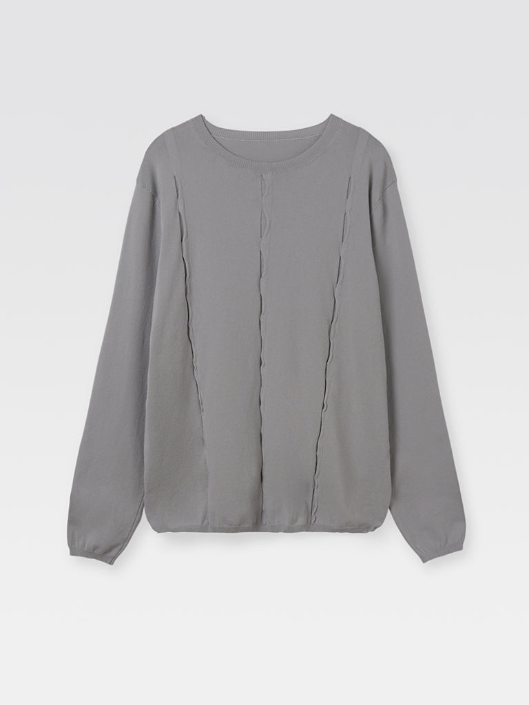 Crew-neck grey jumper made with different knitting techniques in body and arms.