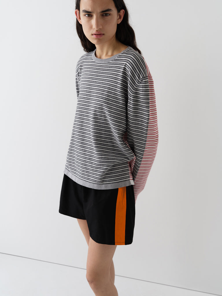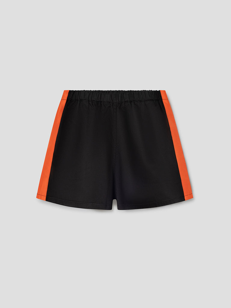 Black structured shorts with orange satin side stripe.