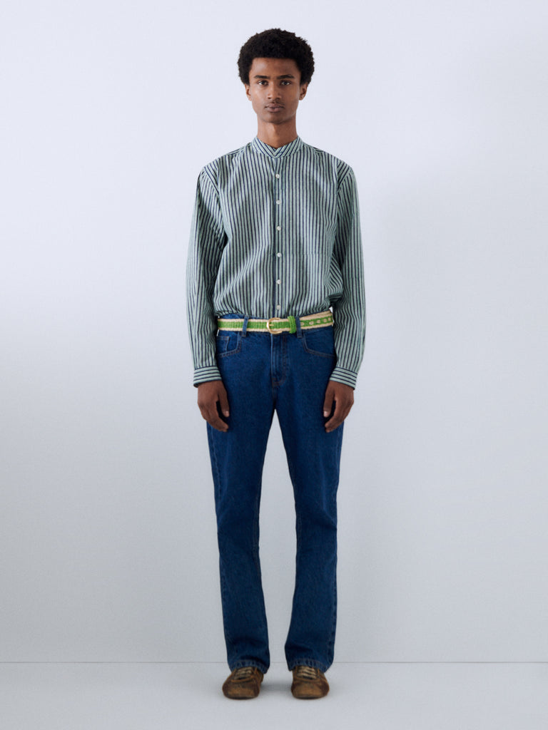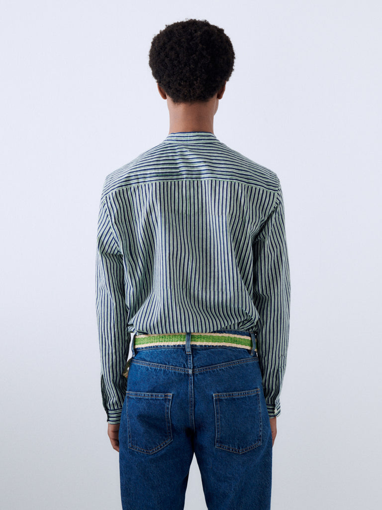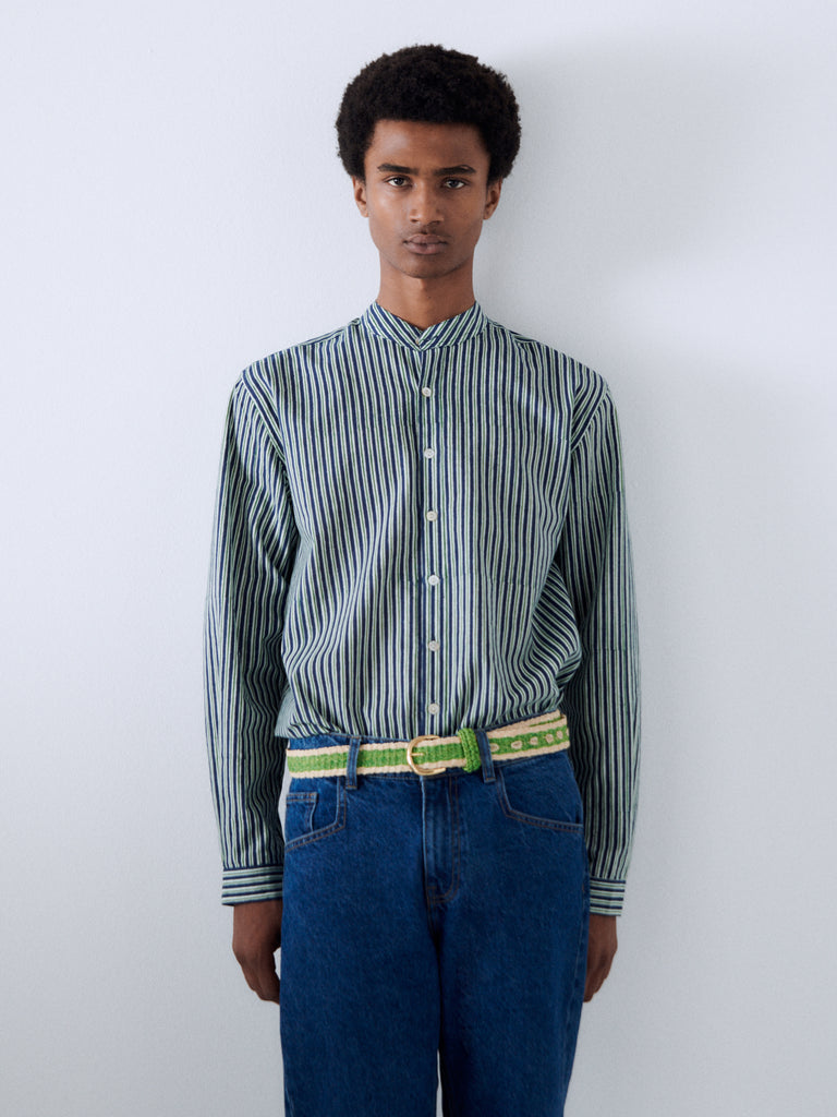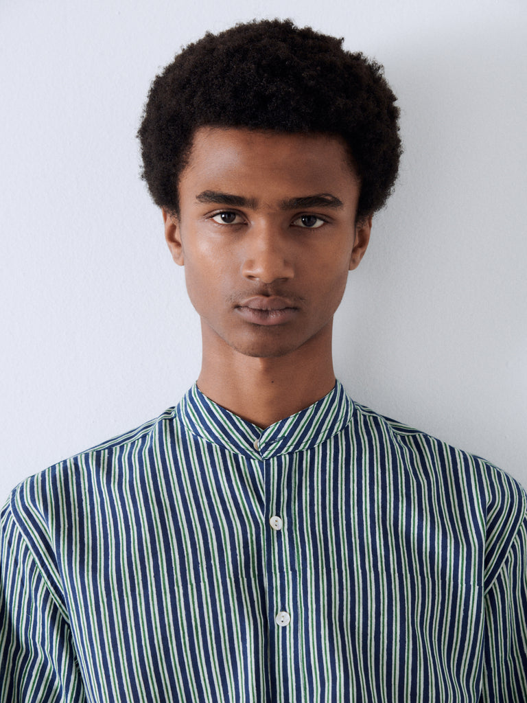 Long-sleeved shirt with Mao collar. Printed in traditional technique of block printing in color navy, green and white stripes.