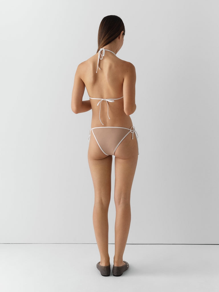 Beige bikini bottom with white trim and side ties.