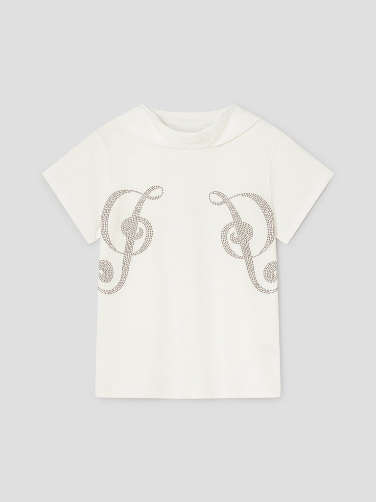 White G music note t-shirt with silver graphic and tonal scarf detail.