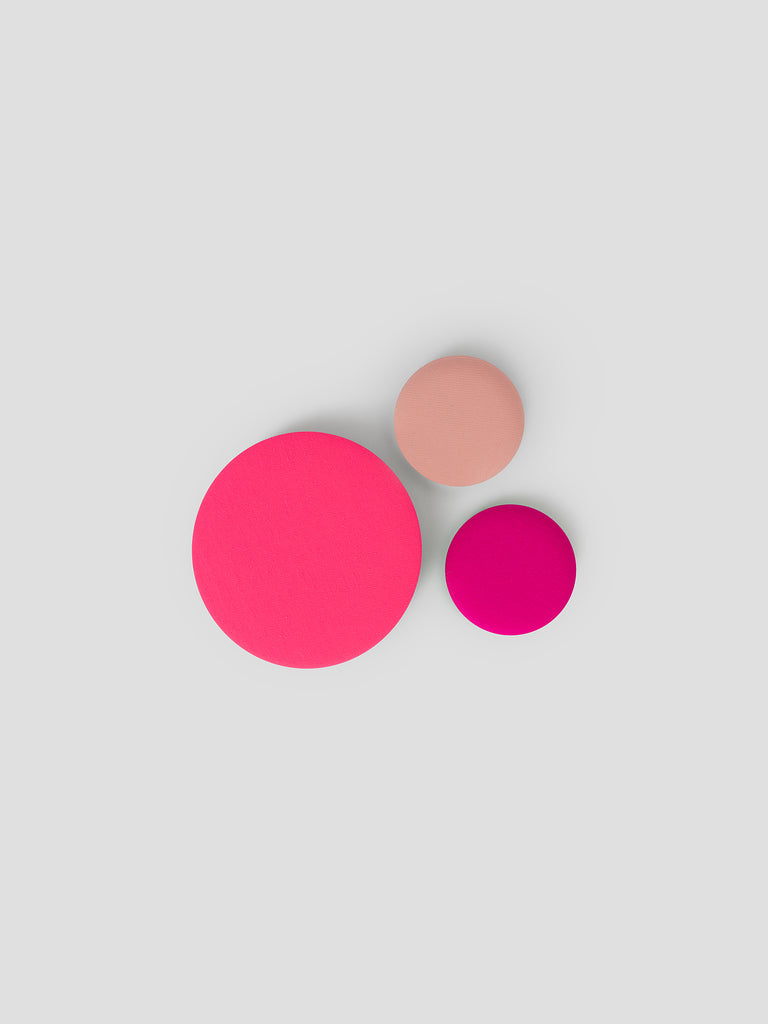 Set of fabric-covered metal pin badges in various shades of pink and different sizes.