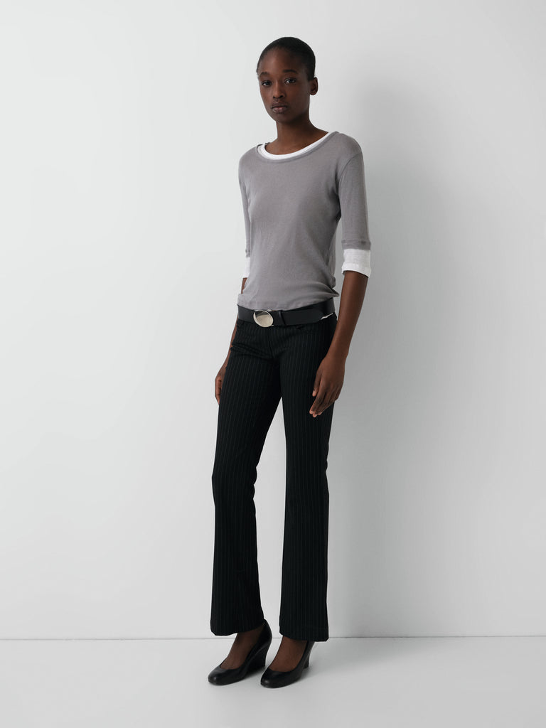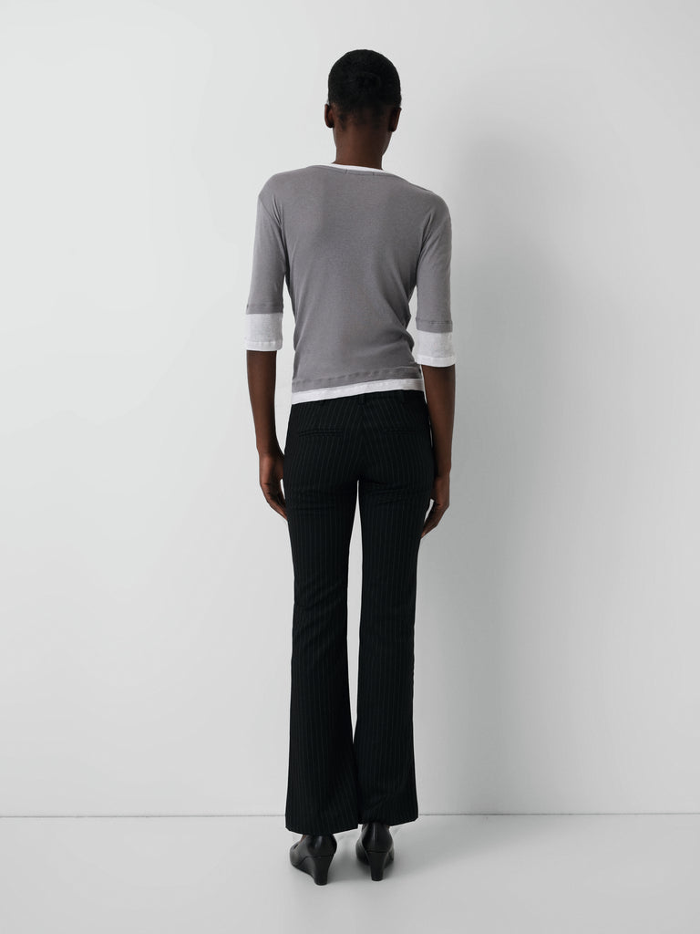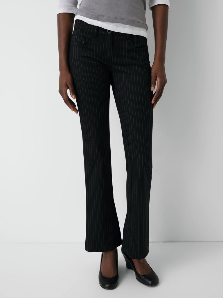 Grey pinstriped tailored trousers.