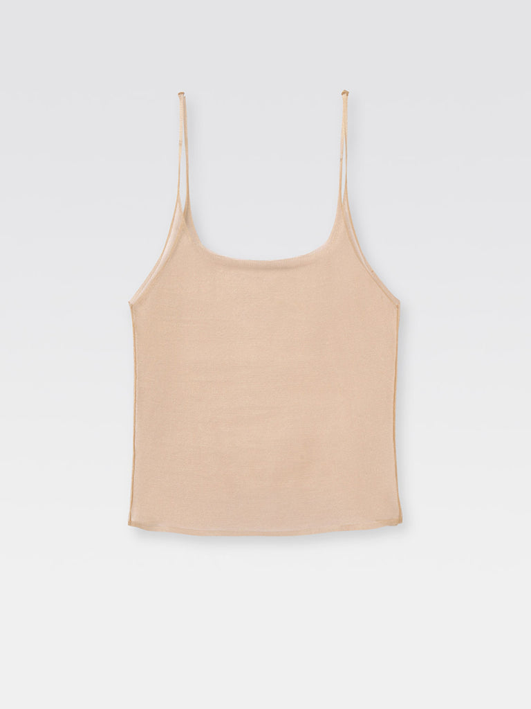 Knitted sleeveless top made of metallic and see through fabric in gold.