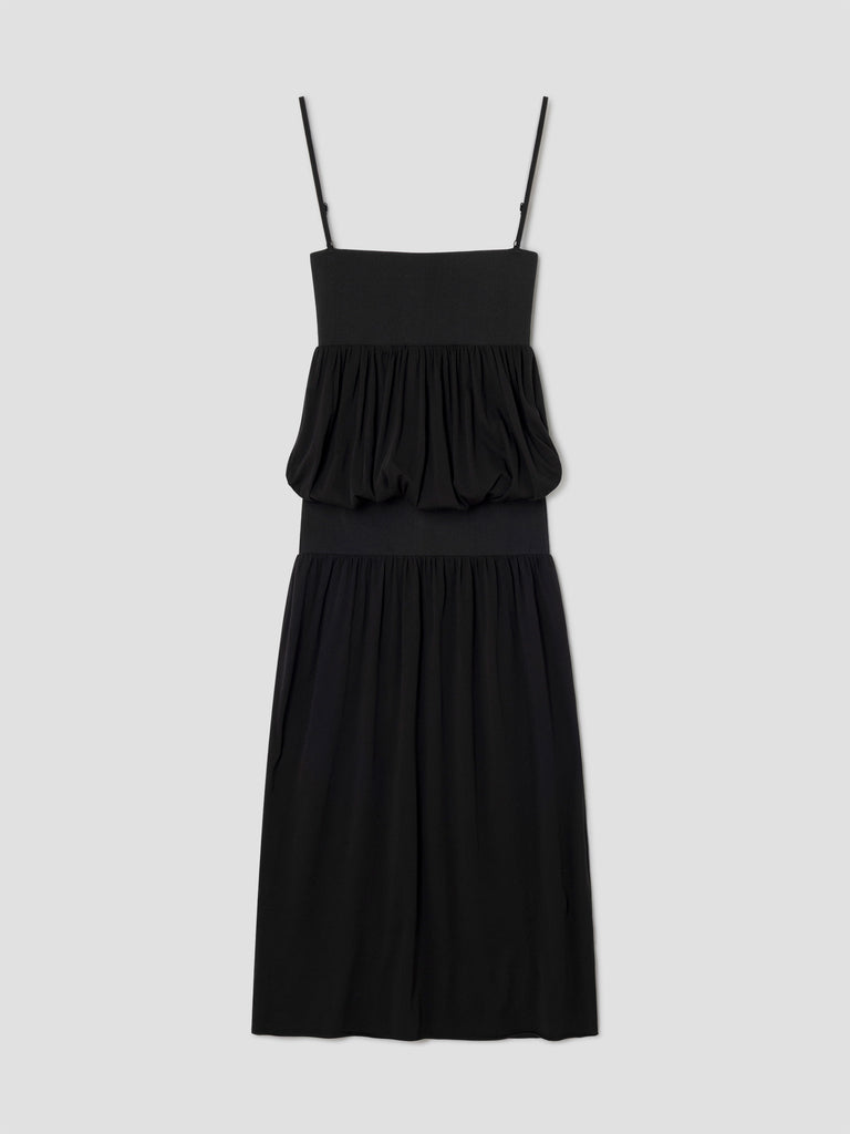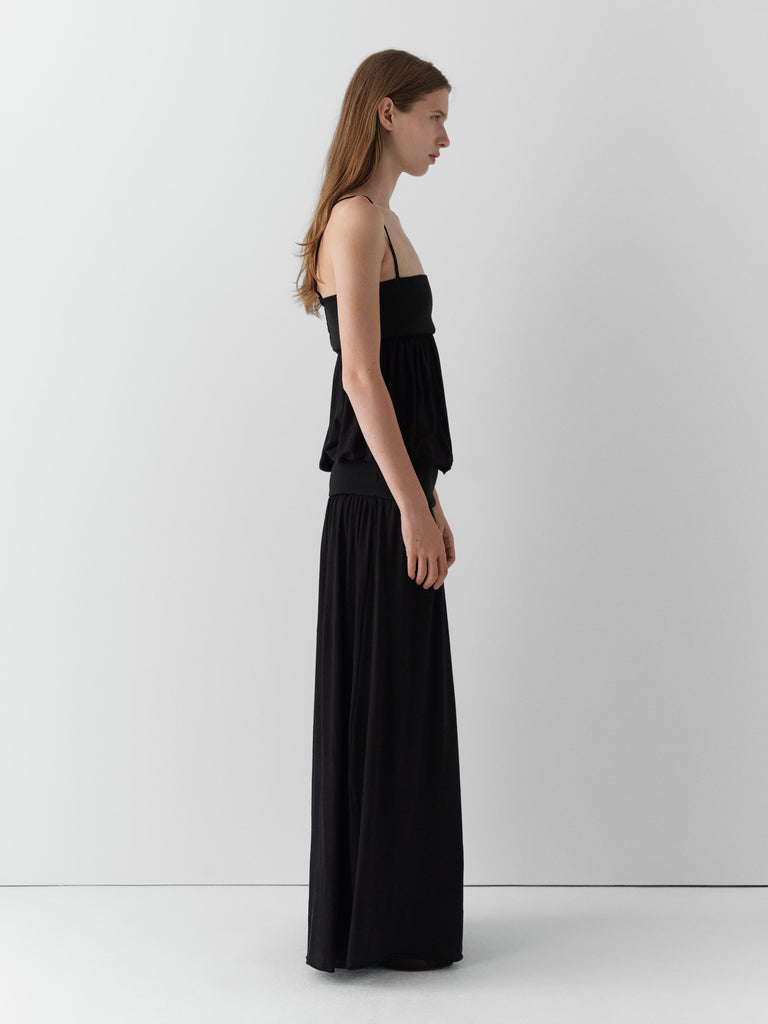 Black draped maxi dress with a two-piece effect.