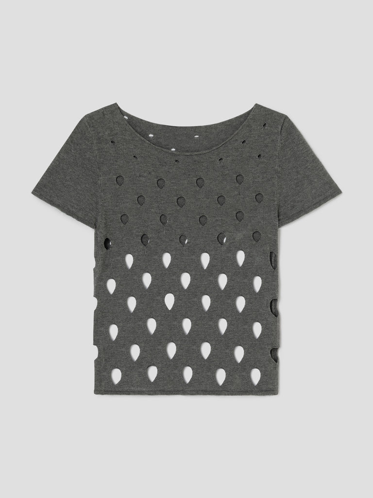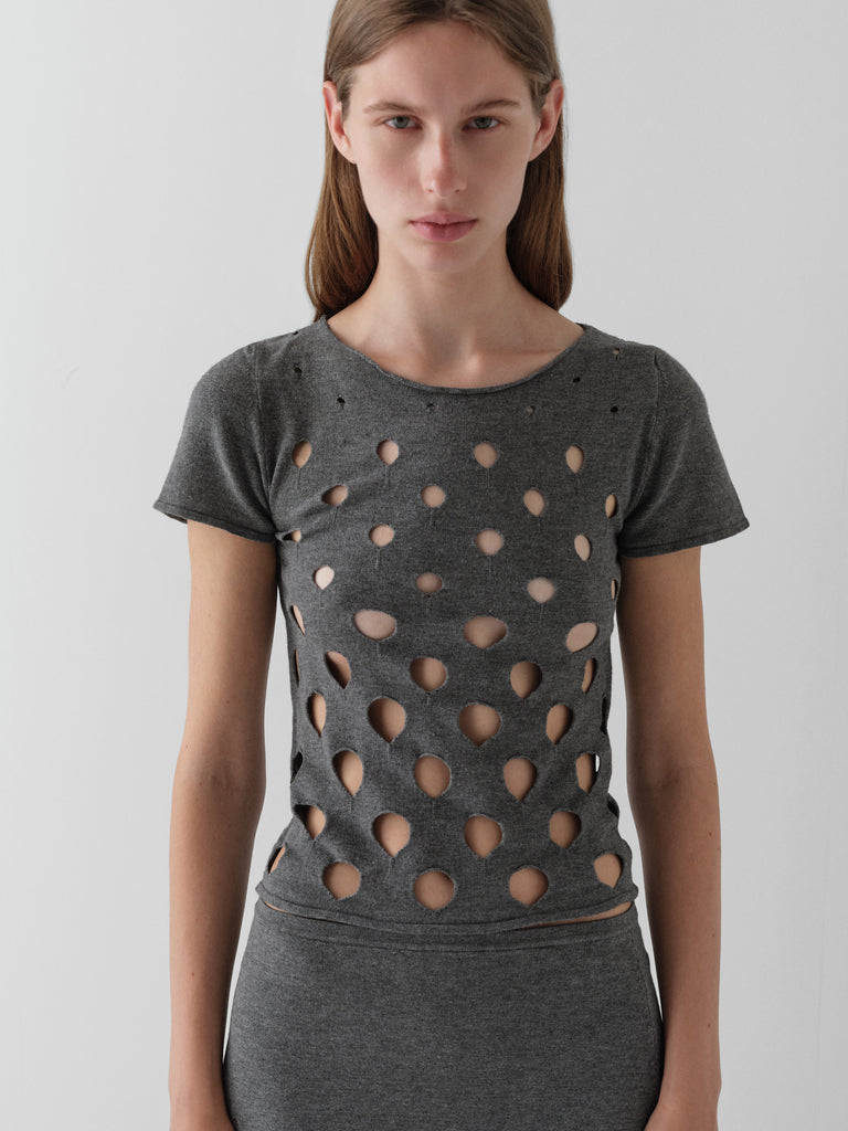 Grey top with asymmetrical circular cut-outs.