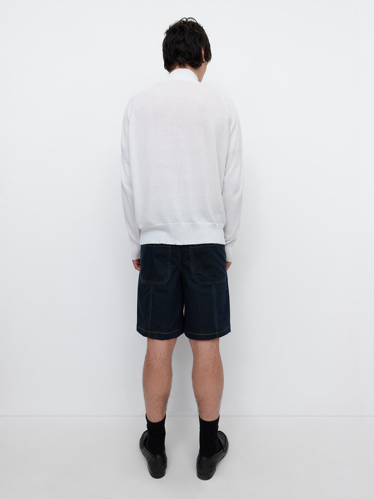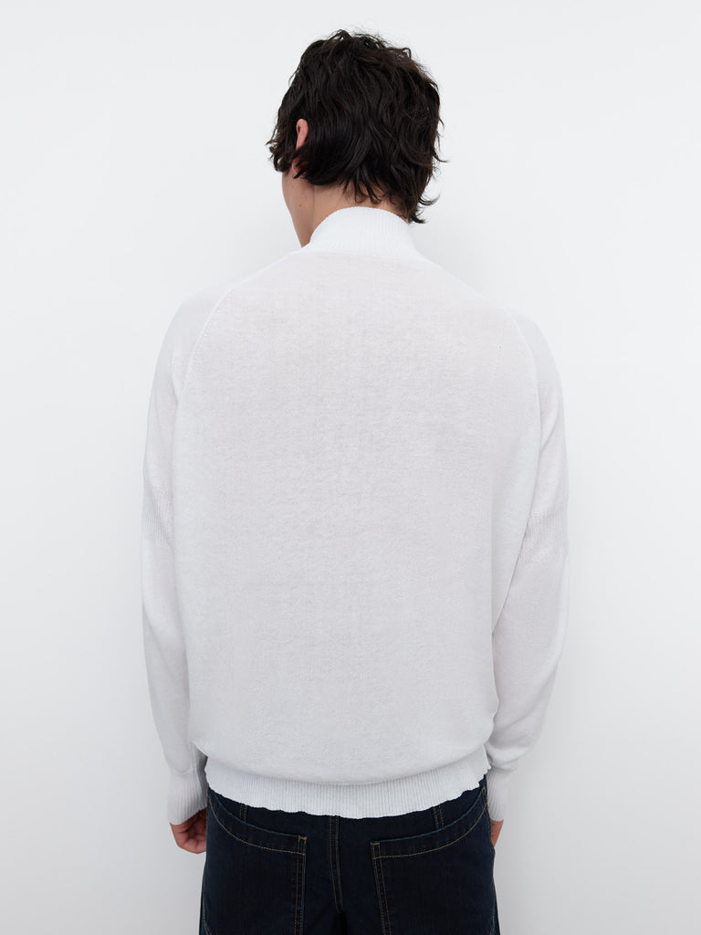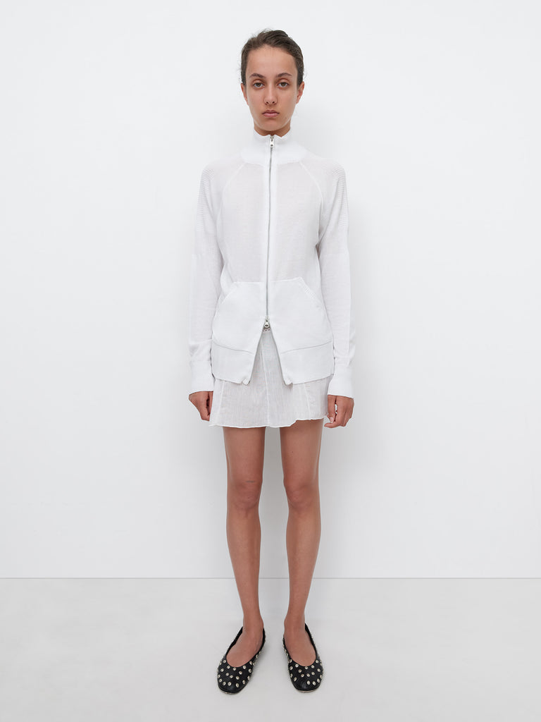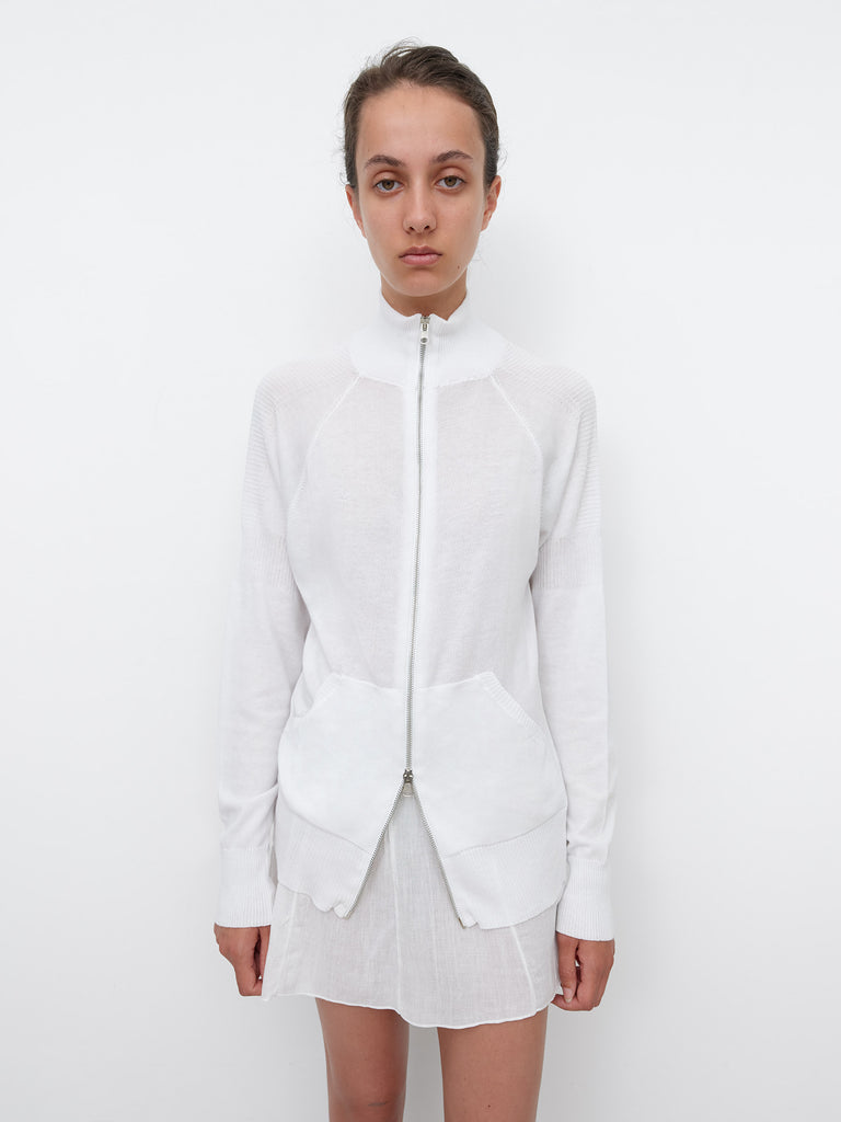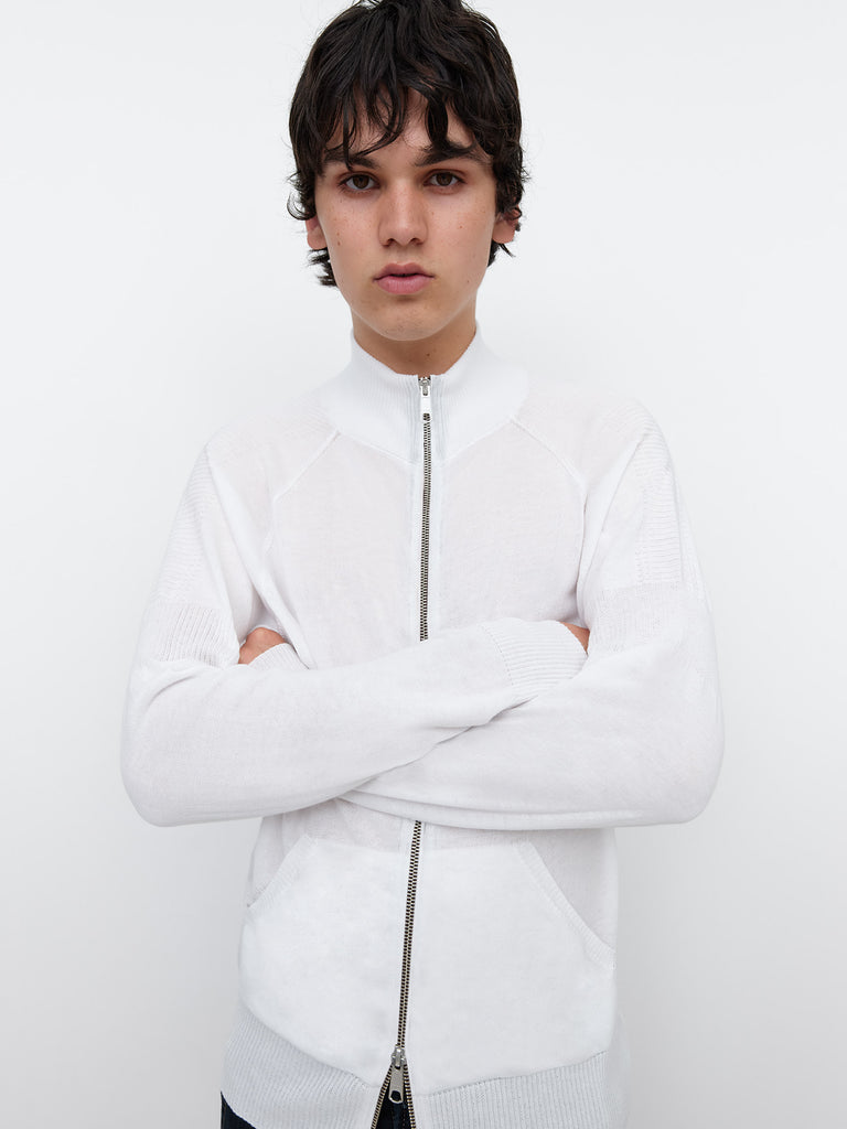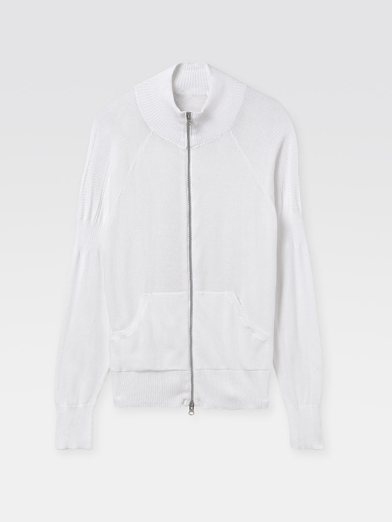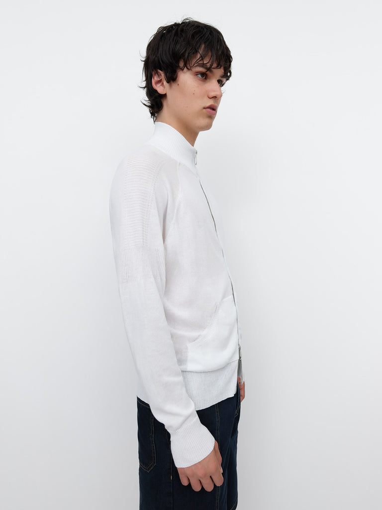 White knit jacket with a high ribbed collar and a full-length metallic zip closure. Designed for men and woman, features a soft, lightweight knit with a front kangaroo pocket and ribbed cuffs.