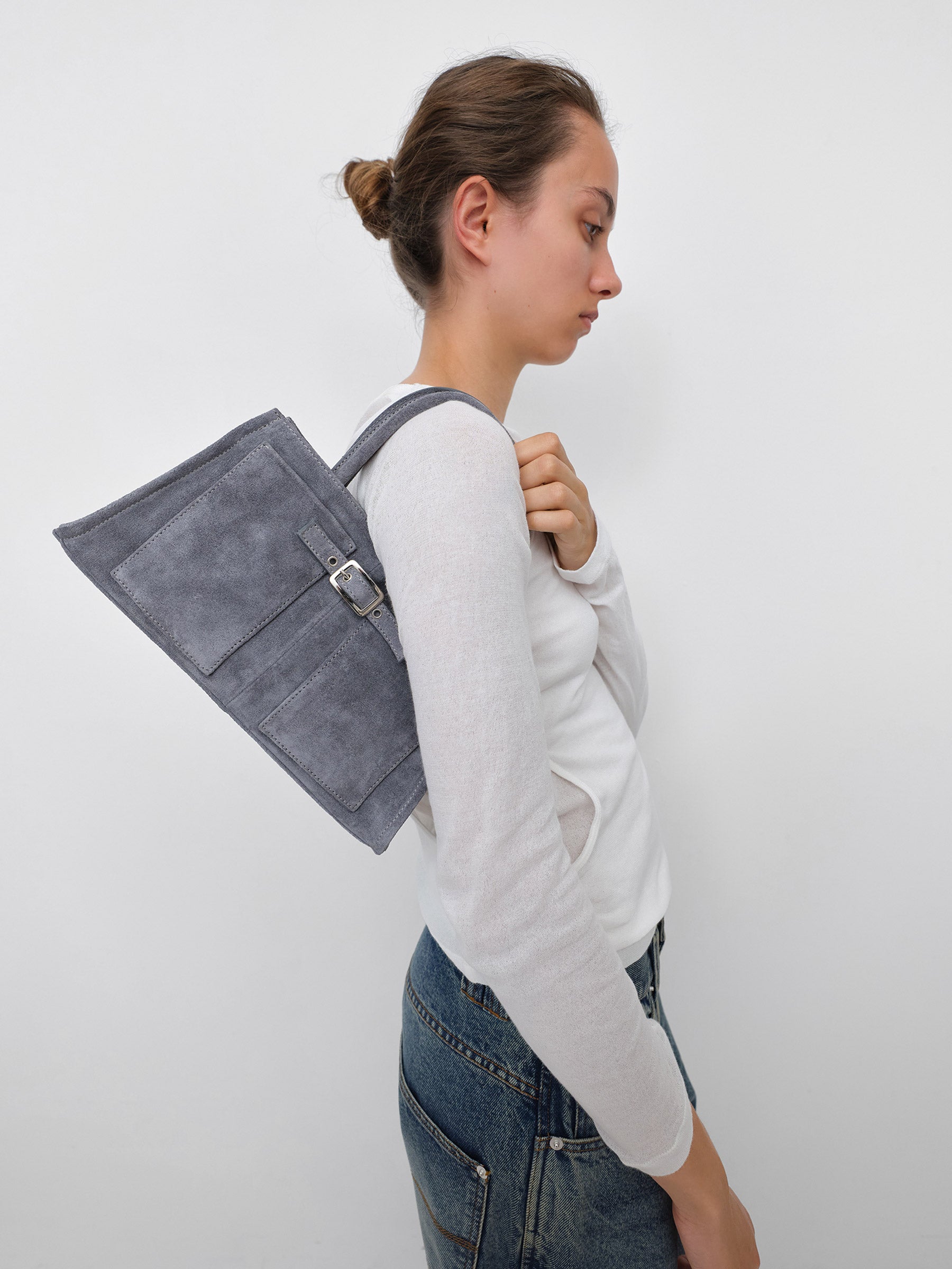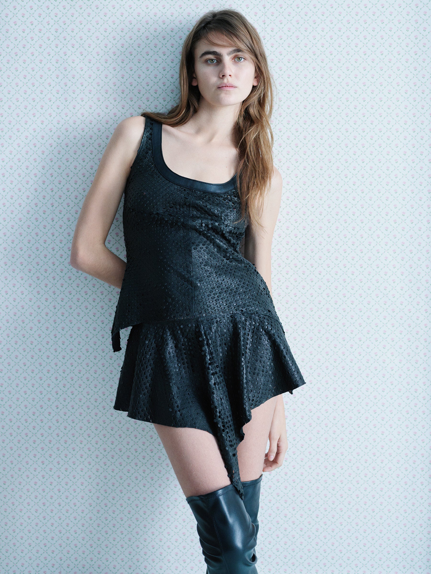 The Gimaguas women’s leather collection — Jackets, dresses, tops, skirts, and trousers crafted in nappa and suede. Contrasting textures with canvas and knitted fabrics add depth and structure. Detailed with buckles, studs, and raw finishes, redefining leather essentials through sculpted silhouettes and sharp constructions.