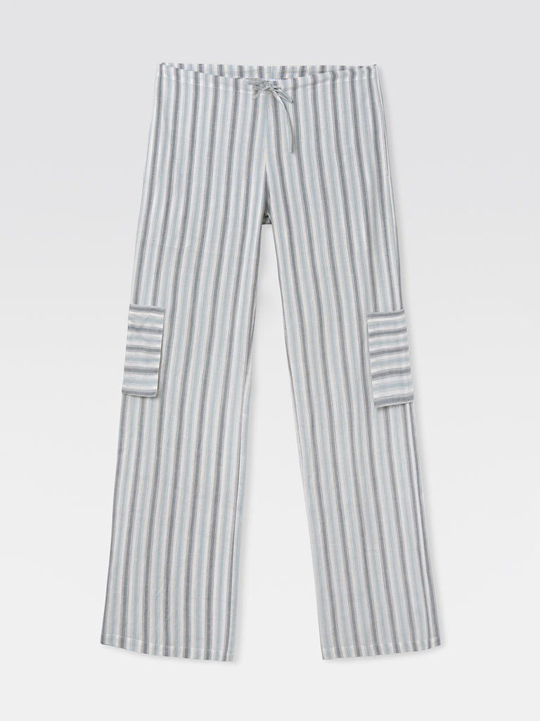 Blue and grey stripes cargo pants with pockets on the sides and adjustable lace.