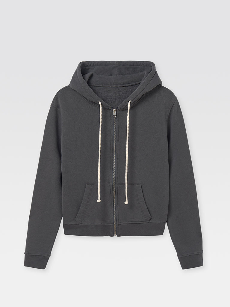 Women's hoodie in black fleece with long sleeves and a matching fabric hood. Features the Gimaguas logo embroidered on the back at waist level, a front kangaroo pocket, and ribbed details at the cuffs and waist. Designed with a flared hem for added movement. Central metallic zipper closure. Regular fit.