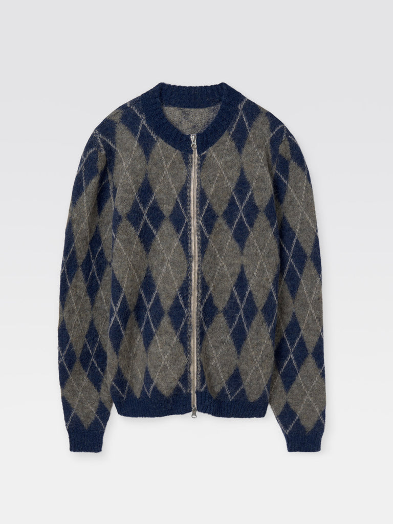 Zip up wool jumper featuring navy and grey argyle pattern.