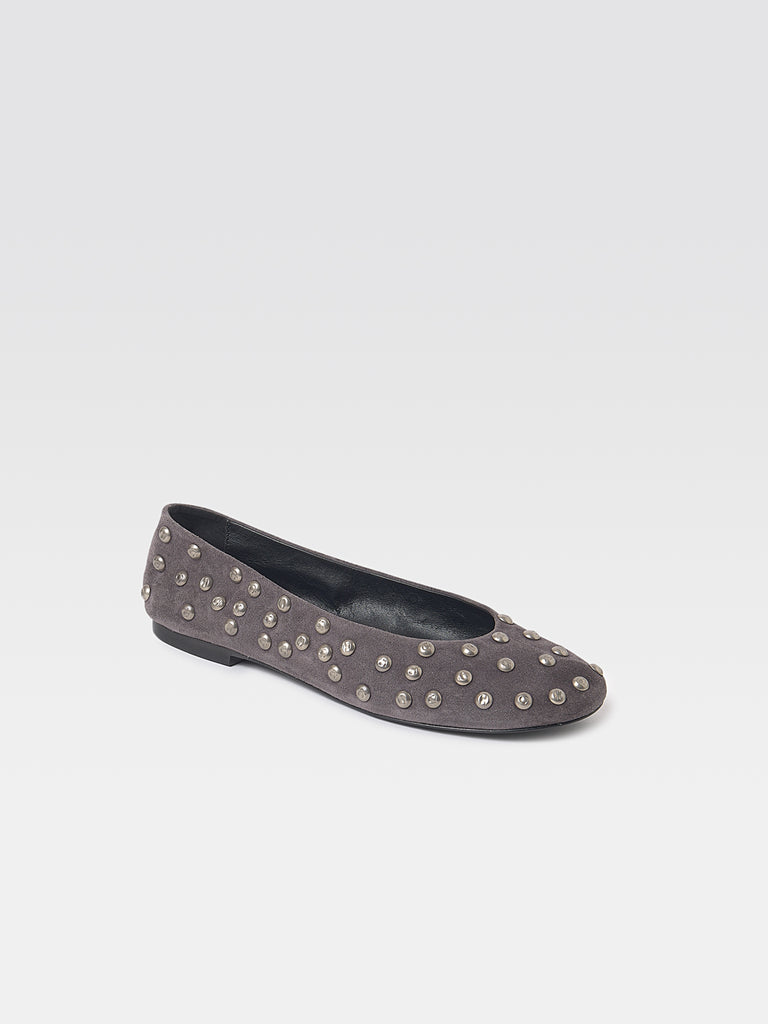 Flat women's ballerina shoes in grey-colored leather, accented with silver-tone flattened studs across the surface.