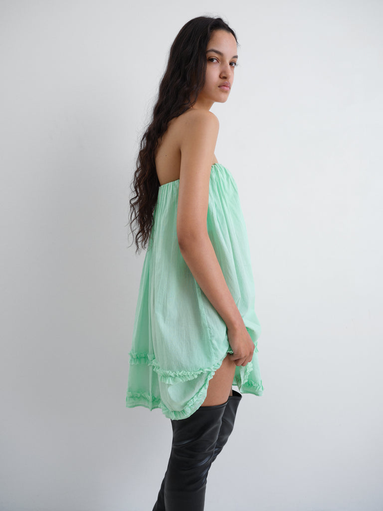 Green women's mini dress in lightweight cotton. Features elastic waistband, inner corset-style structure and layered ruffles at the hem. It can also be used as a midi skirt. Finished with a gathered texture.