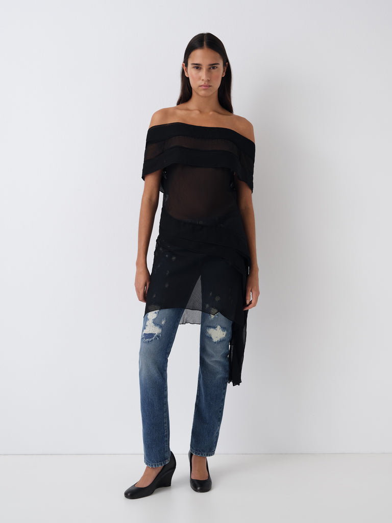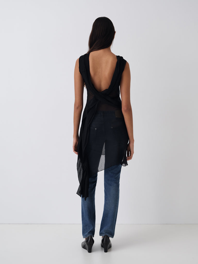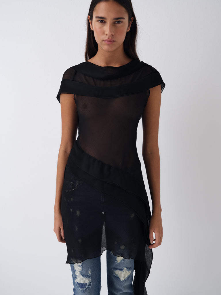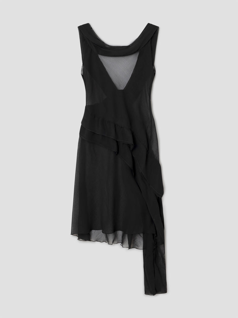 Black semi-sheer mini dress with a draped side ruffle.