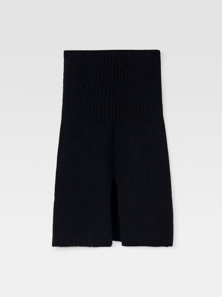 Midi knitted skirt, featuring same fabric and color rib on the waist and a split on the back center in black.