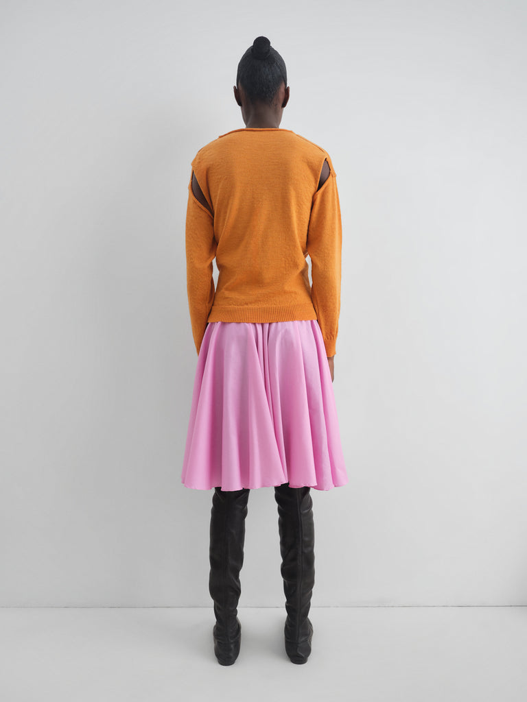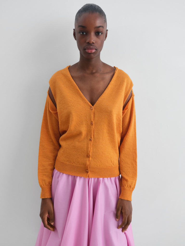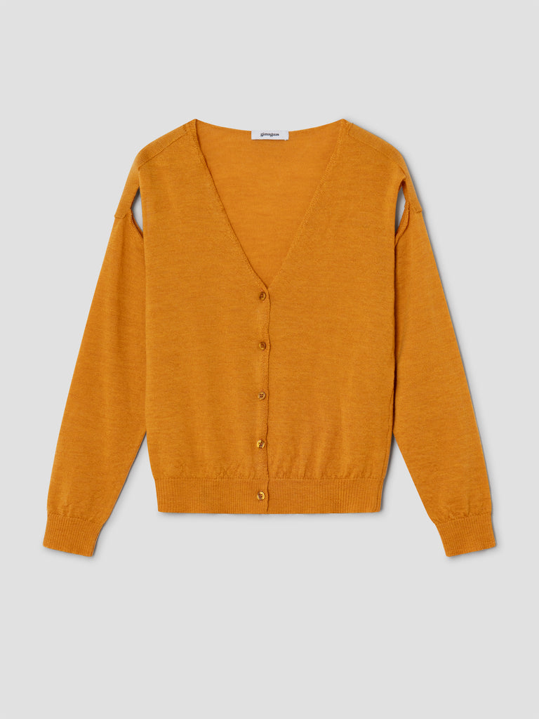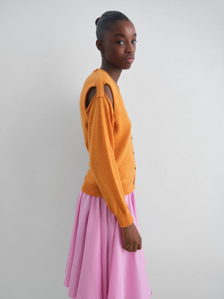 Orange wool cardigan with shoulder cut-outs.