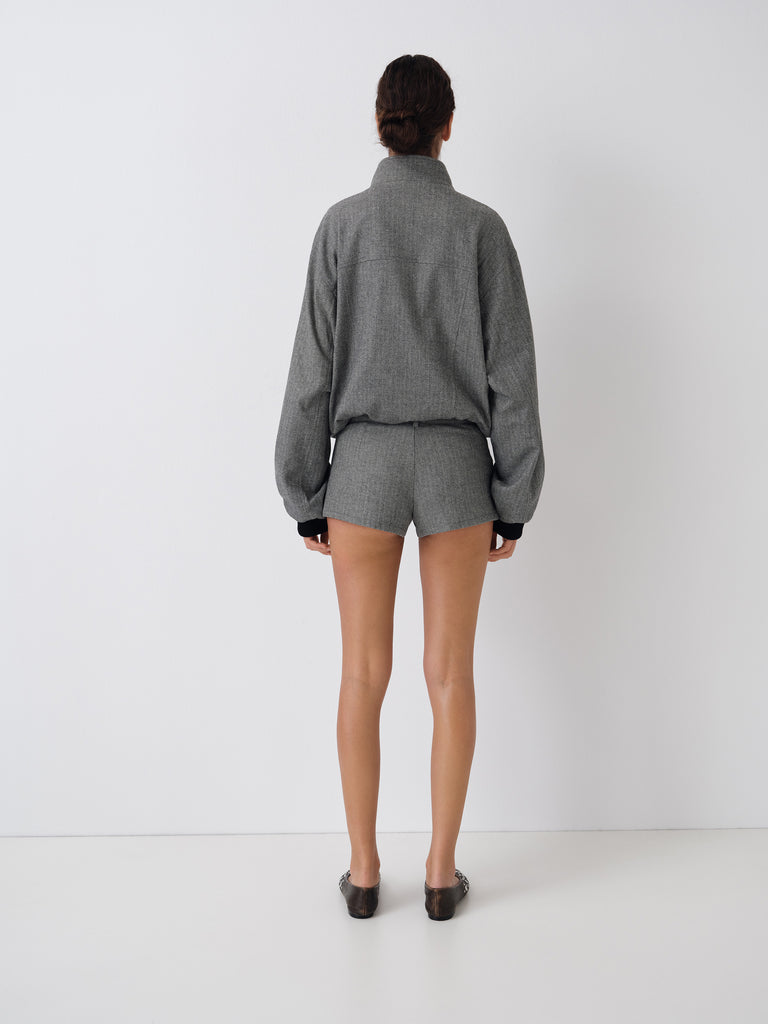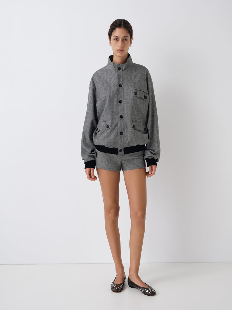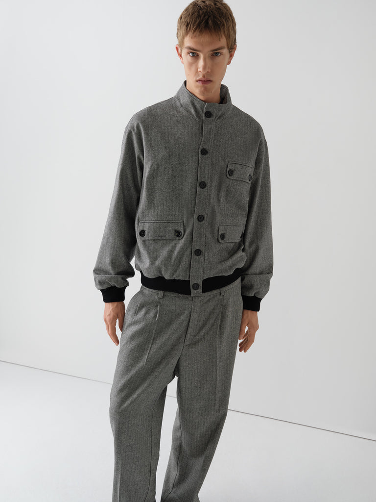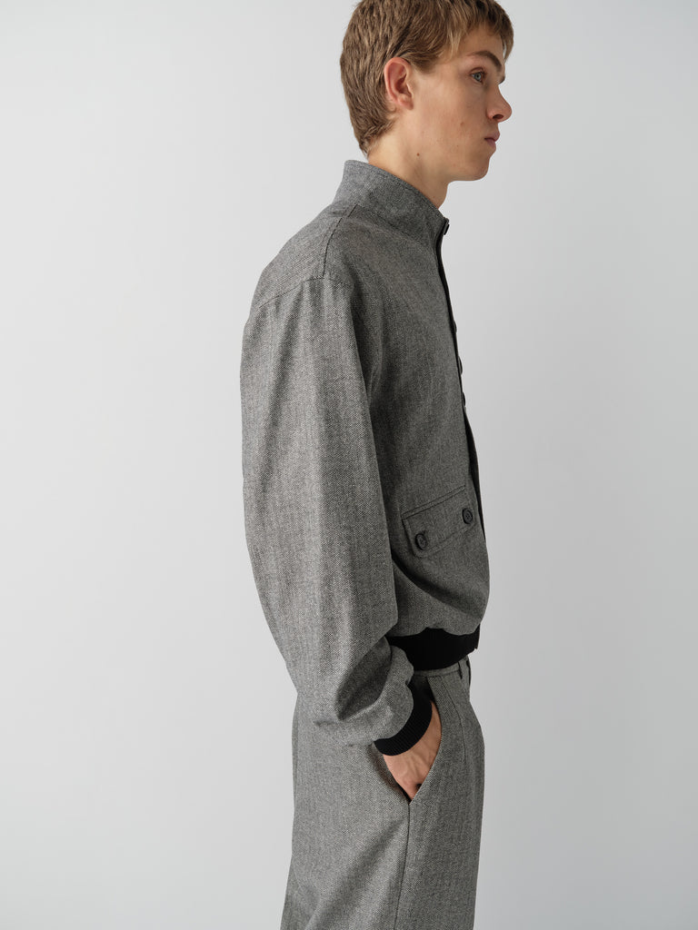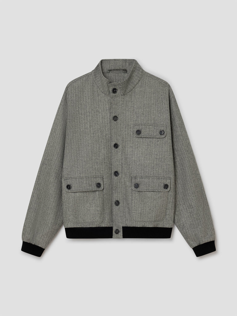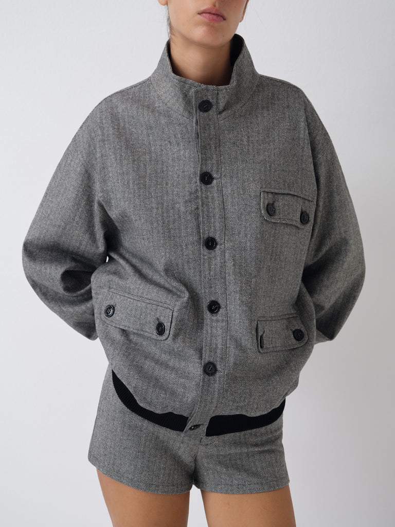 Grey and beige herringbone jacket with mandarin collar and contrast trims.
