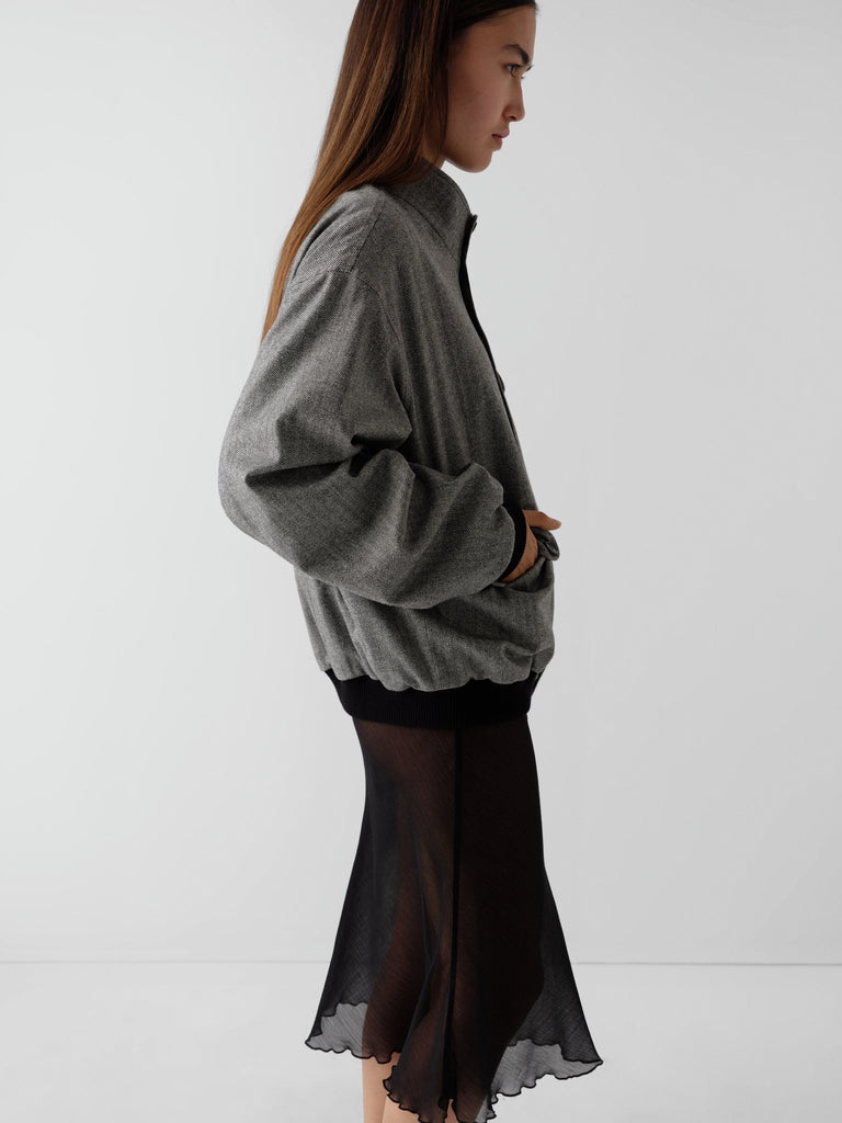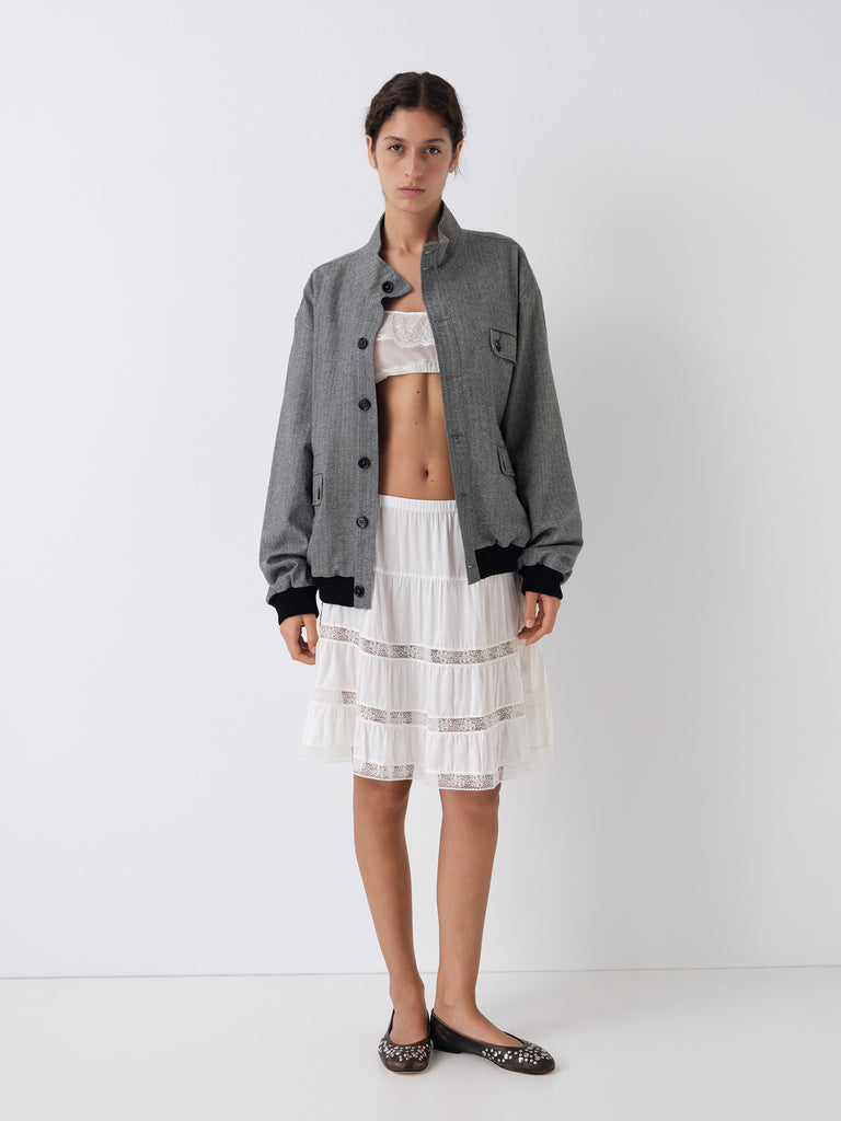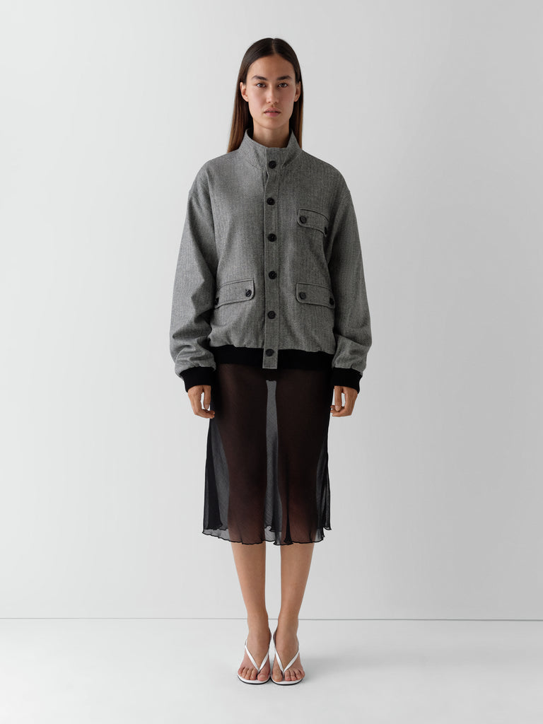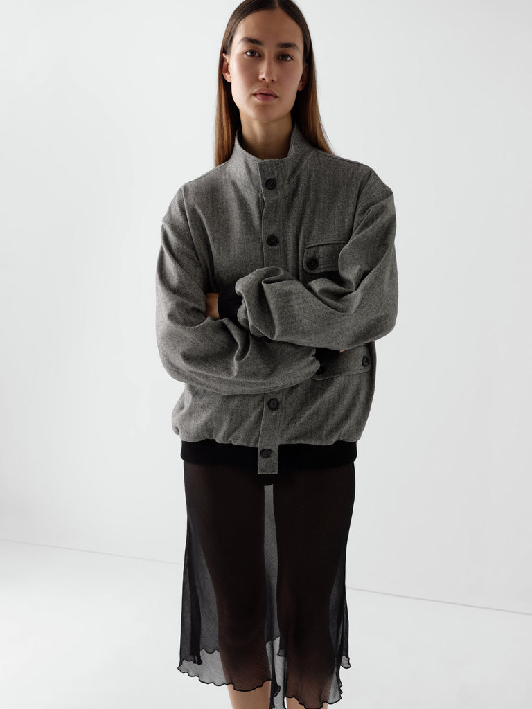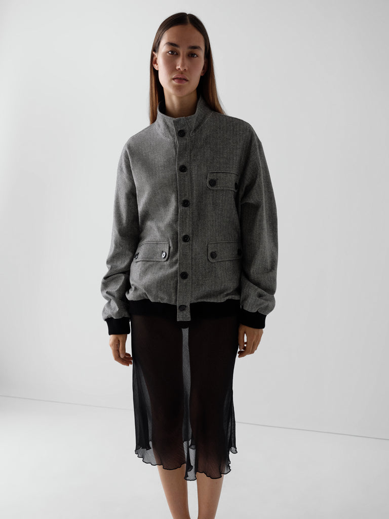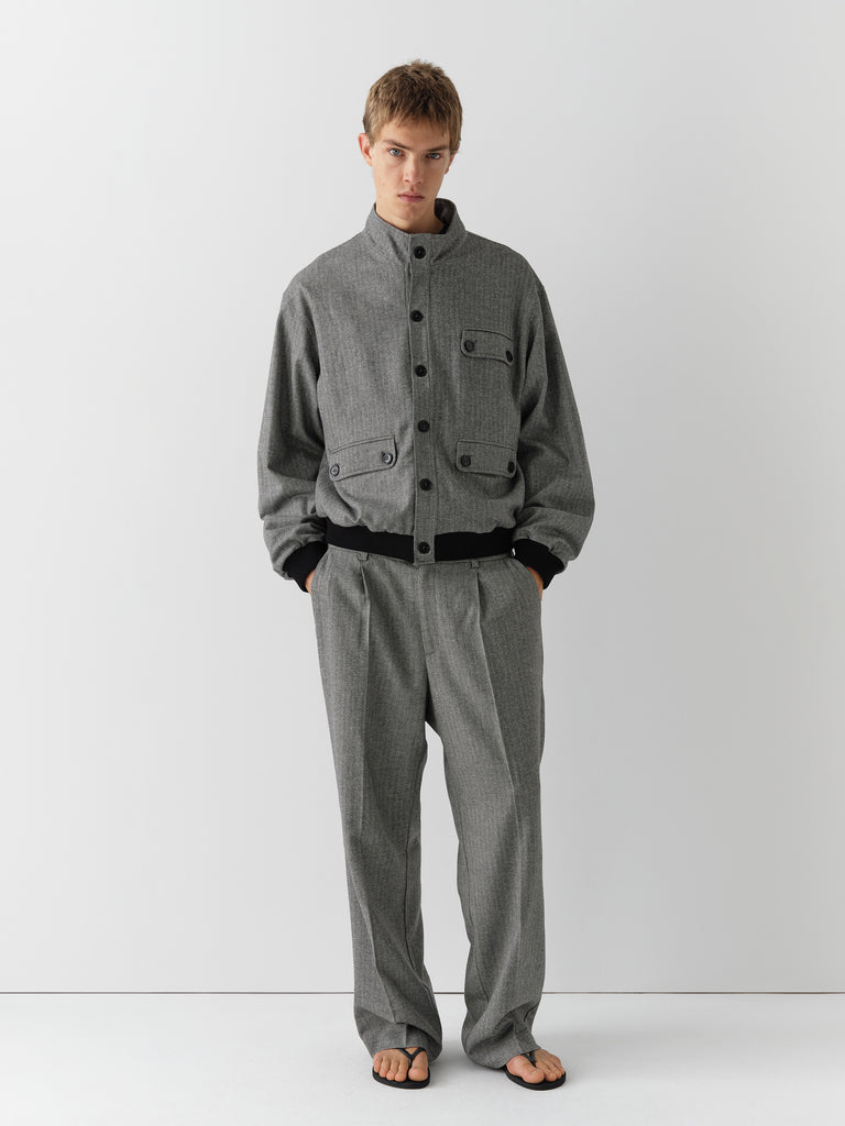 Grey and beige herringbone jacket with mandarin collar and contrast trims.