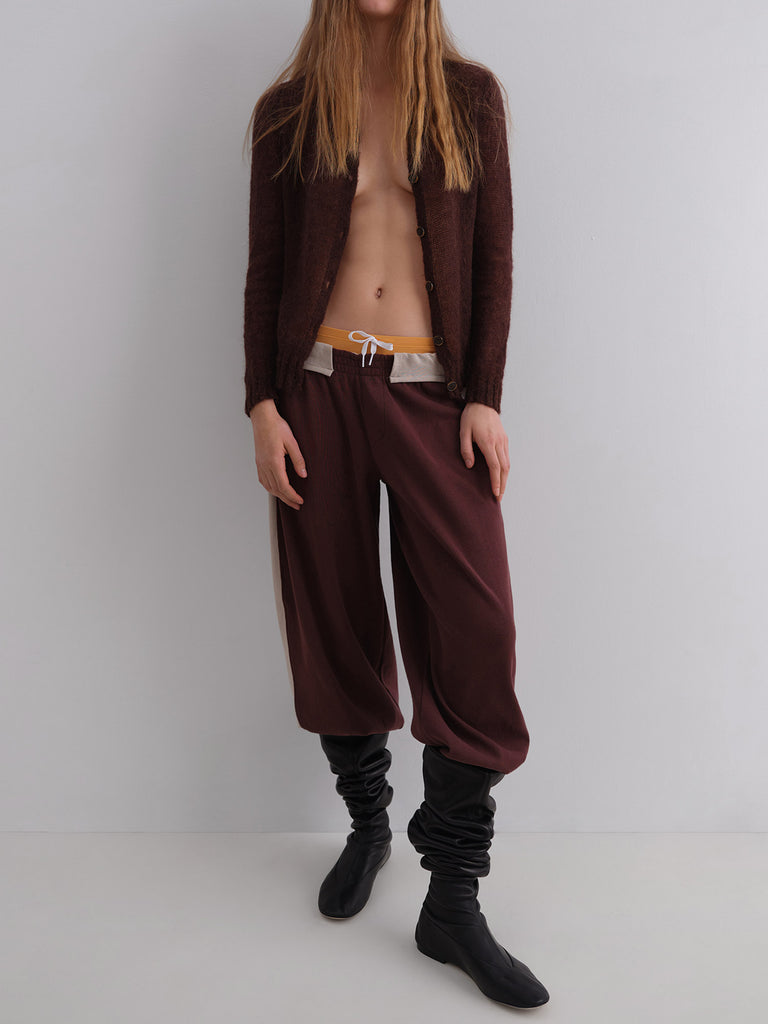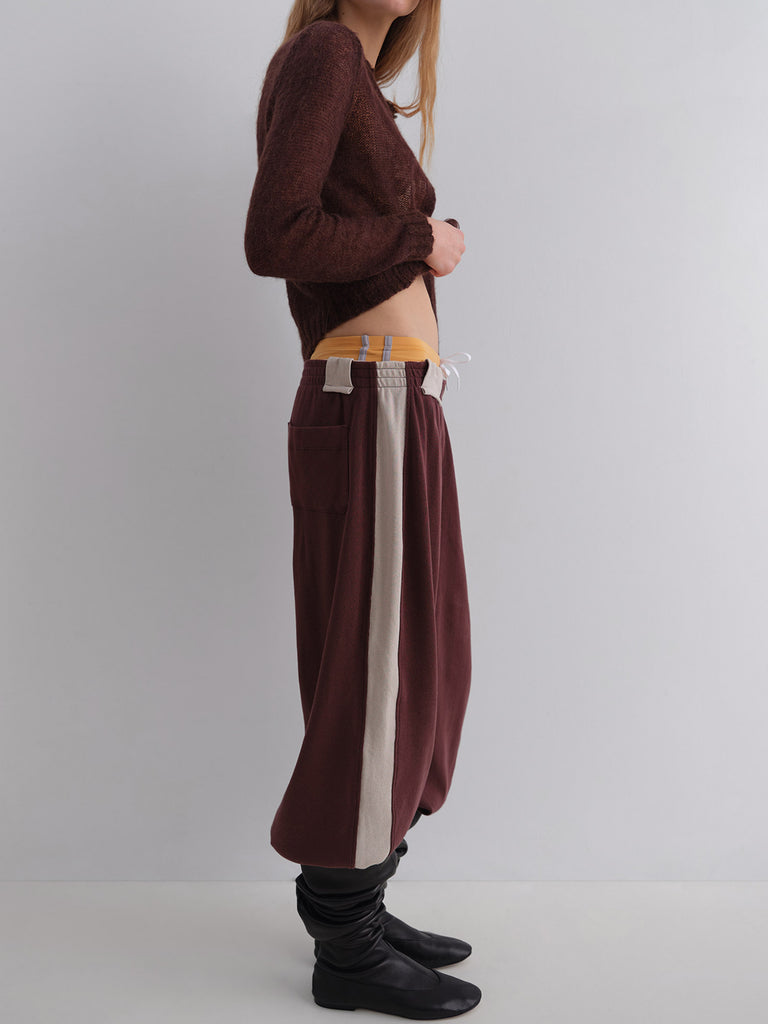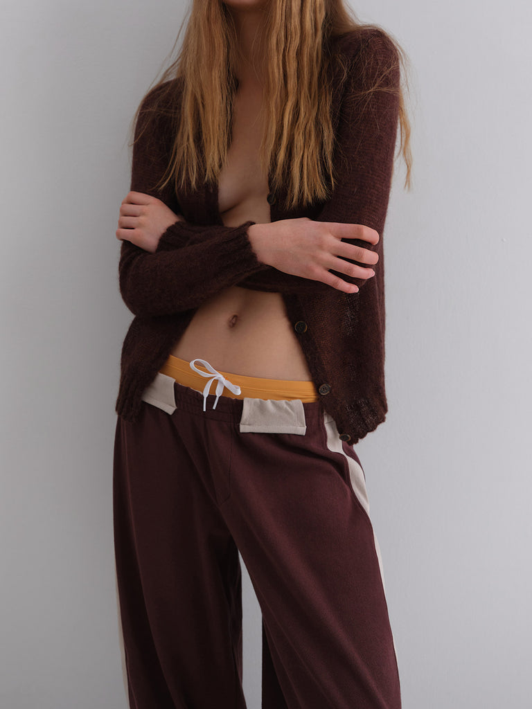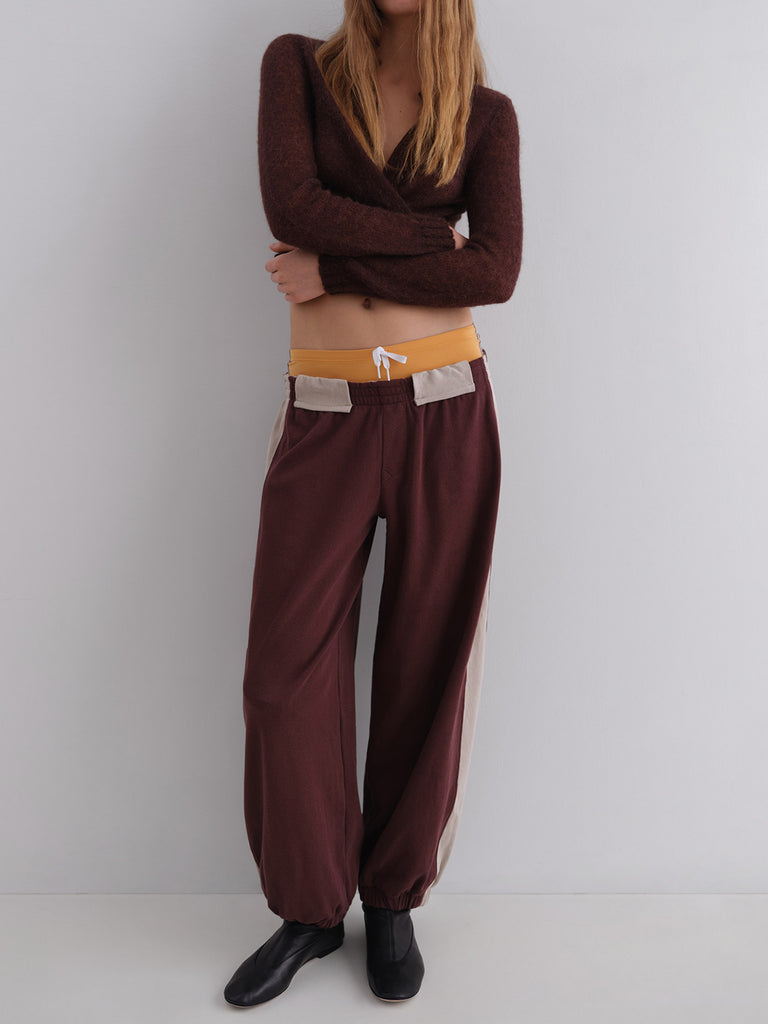 Brown low-rise trousers with white patch details.