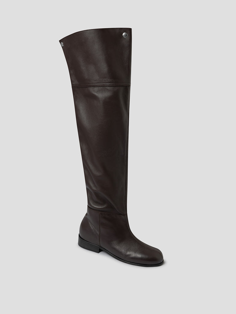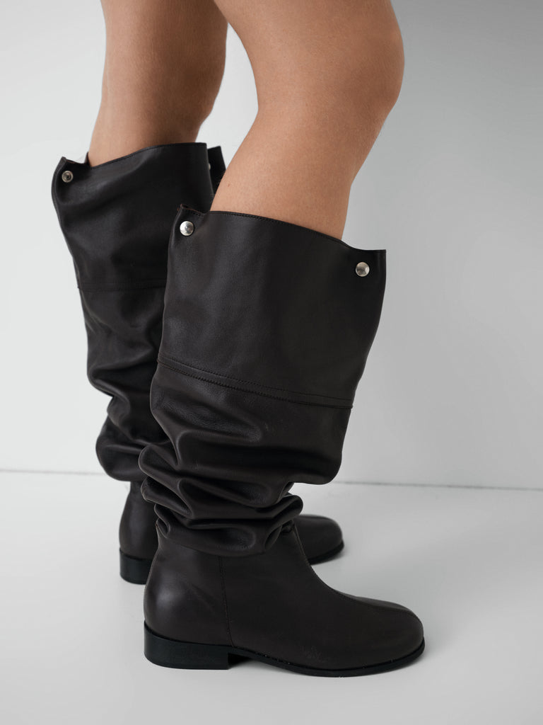 Brown over-the-knee leather boots with round toe and soft slouchy fit.