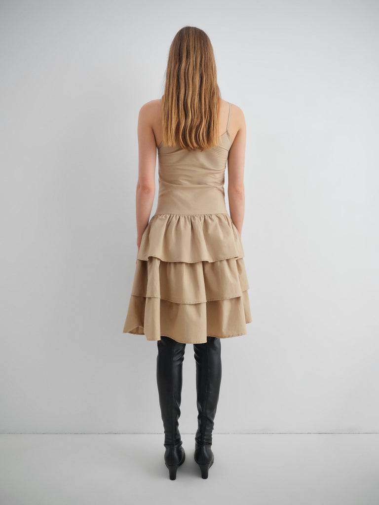 Beige midi dress with fitted top and low-rise tiered skirt.