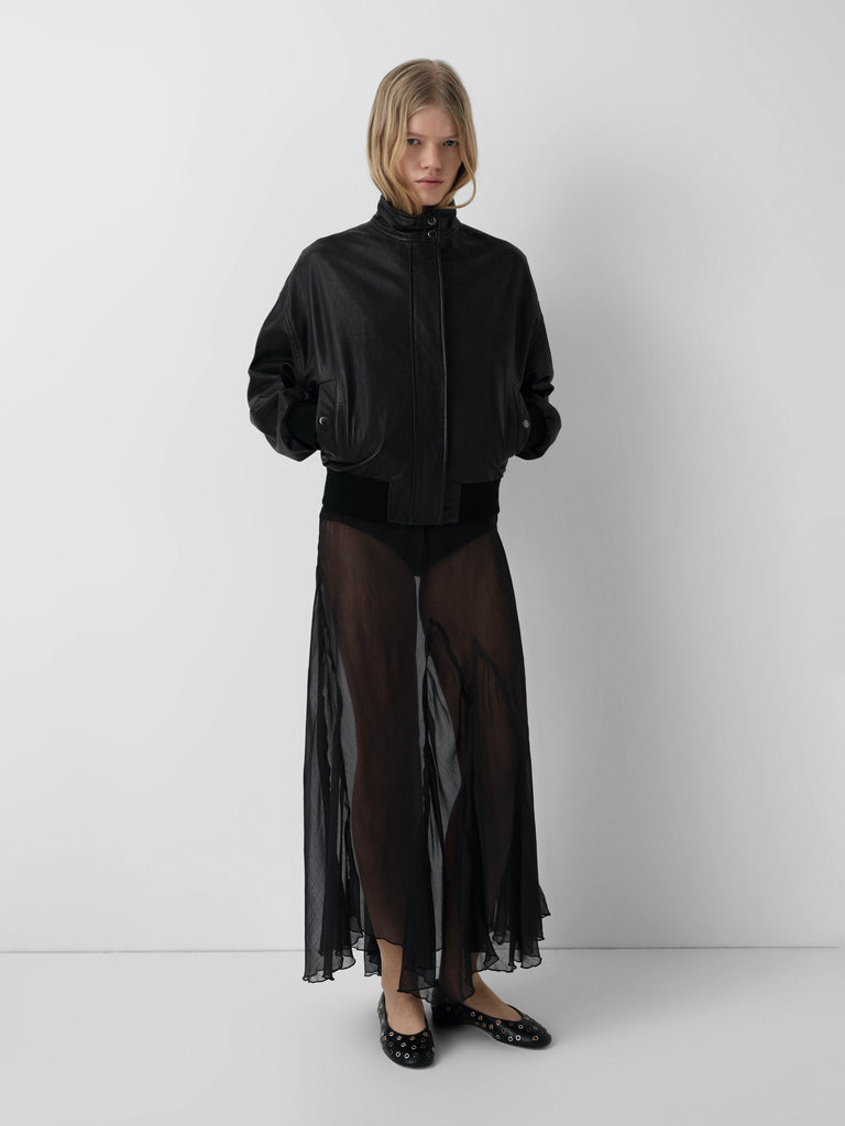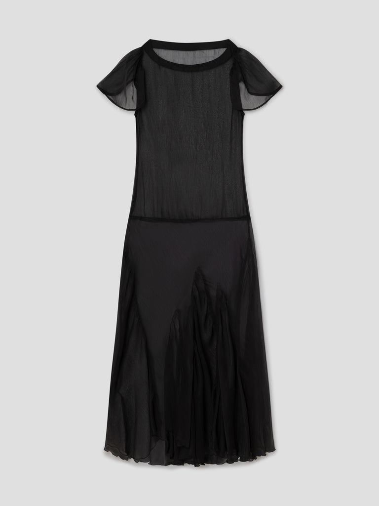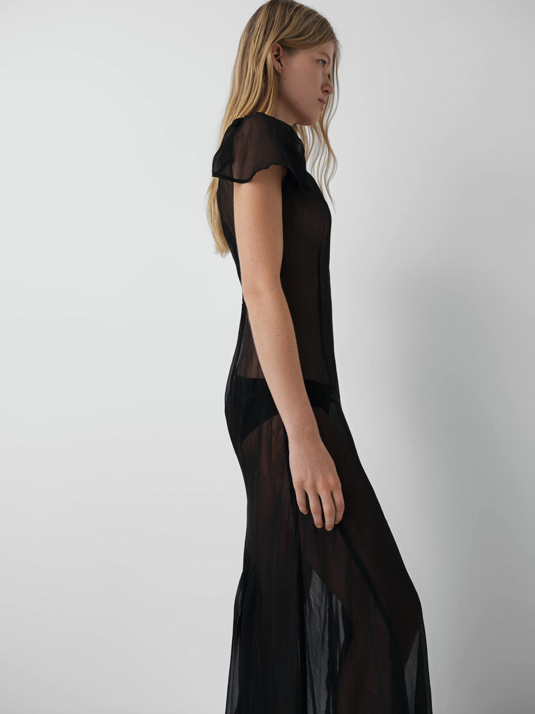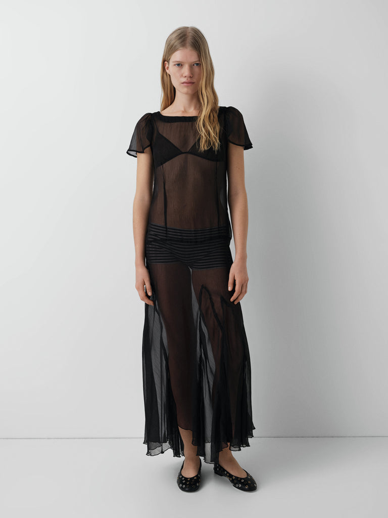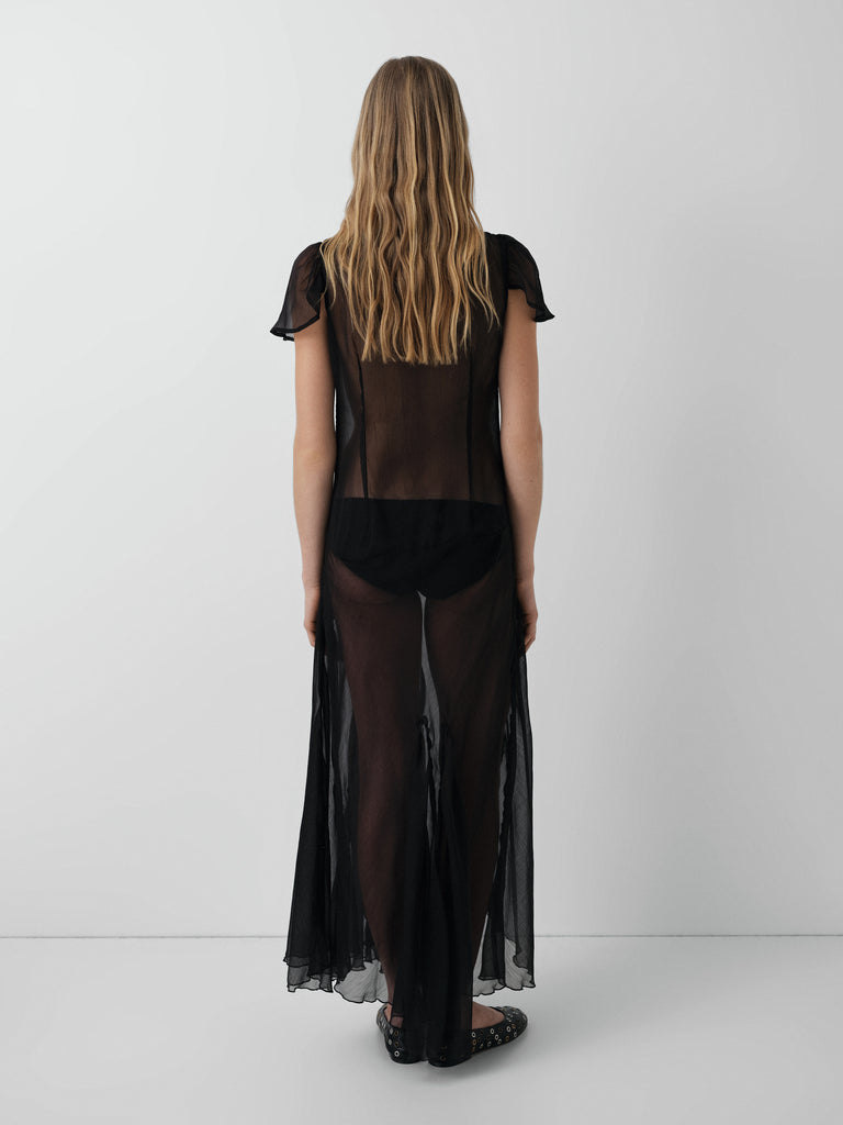 Black sheer panel maxi dress with flutter sleeves and fluid hem.