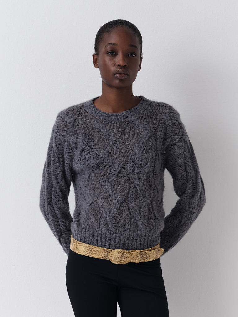 Dark grey cable-knit jumper with soft texture.
