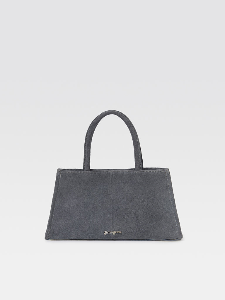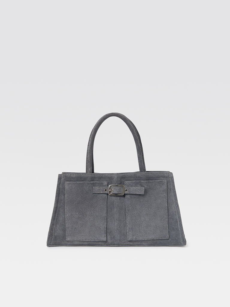 Grey women's suede mini handbag featuring two sturdy handles and a structured silhouette. Designed with two front patch pockets and a suede belt detail with a silver buckle. The interior is lined with soft cotton fabric and includes an internal suede pocket. Secures with a discreet magnetic closure.