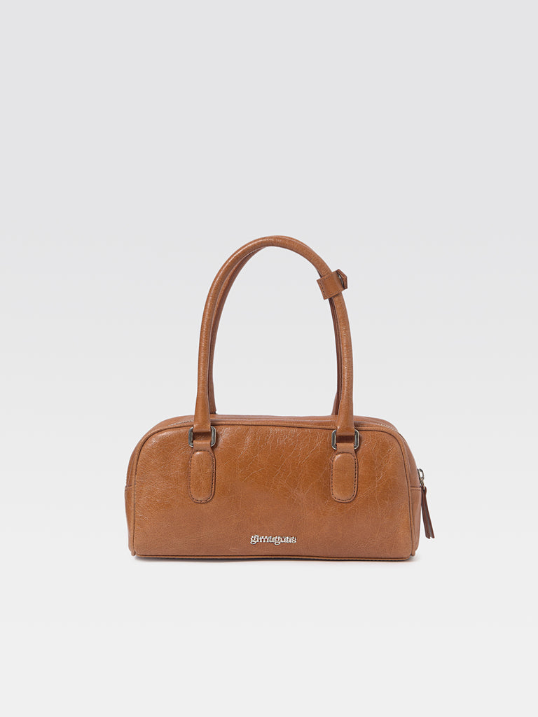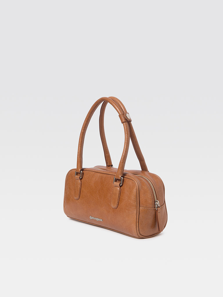 Made from camel leather, with a smooth finish and piping detail crafted from the same material. It is secured with a durable metal zipper and features two round handles, also made from matching leather.