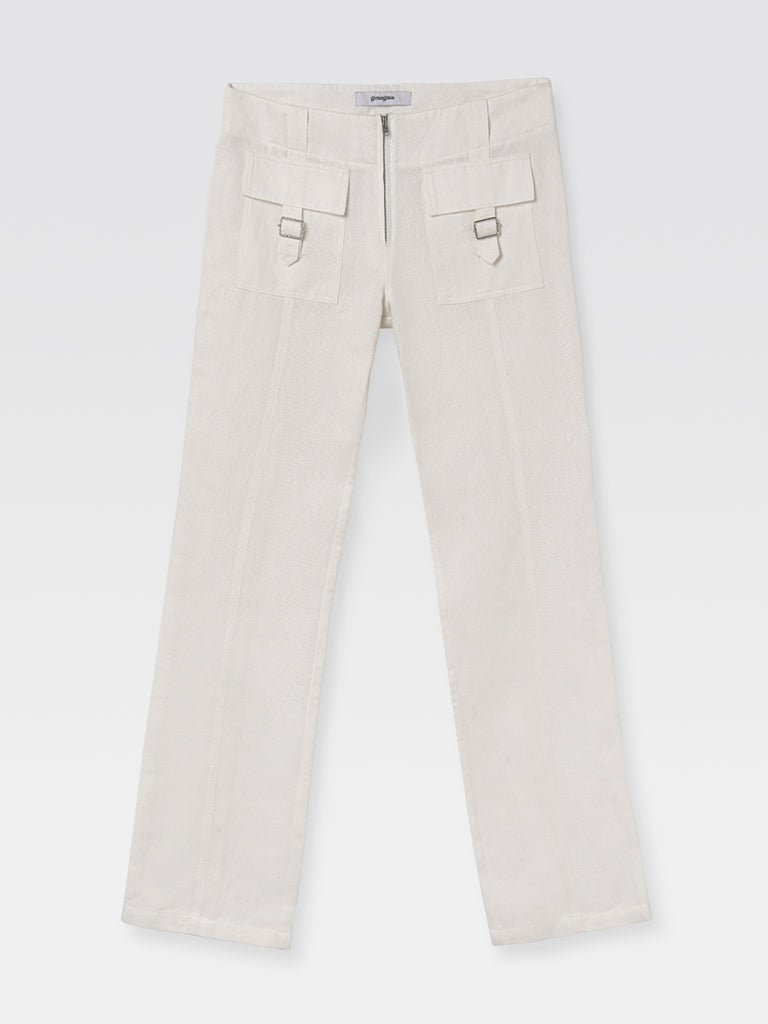 Low-rise pants cut to a straight fit with frontal invisible zip closure.