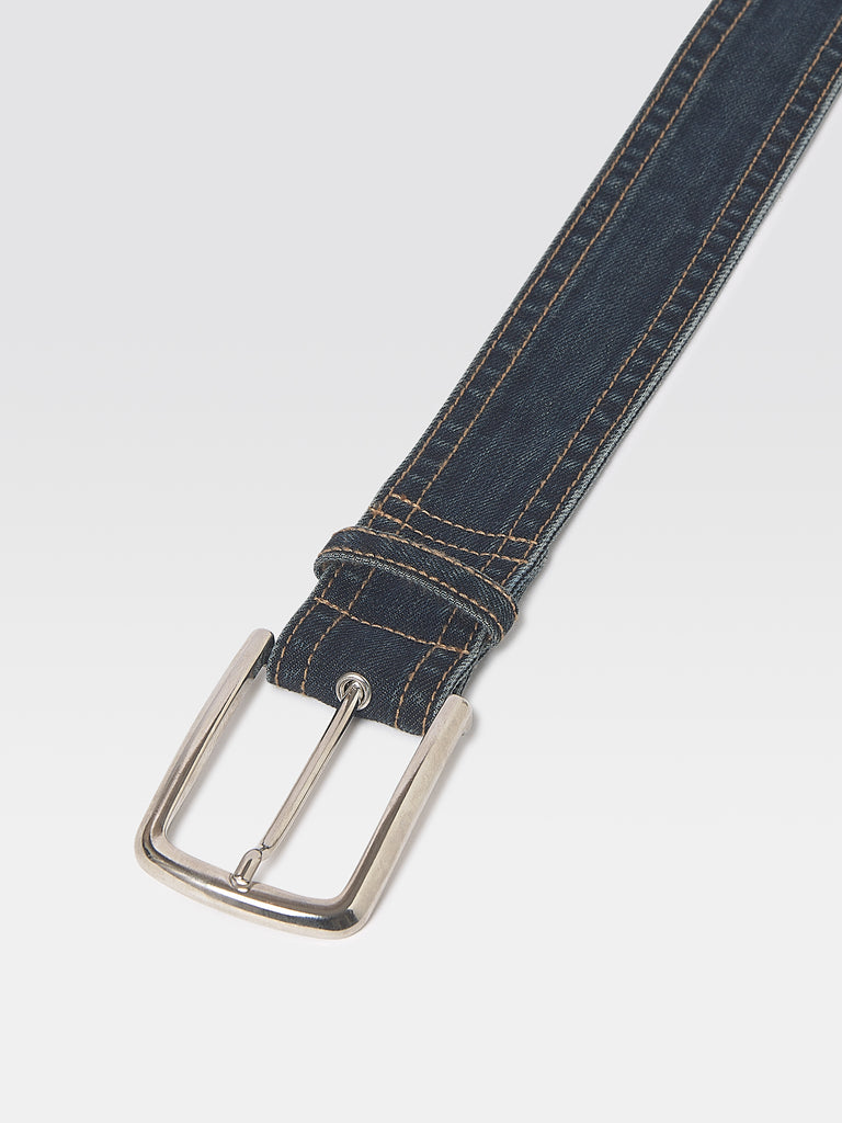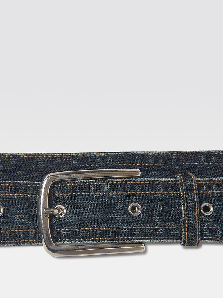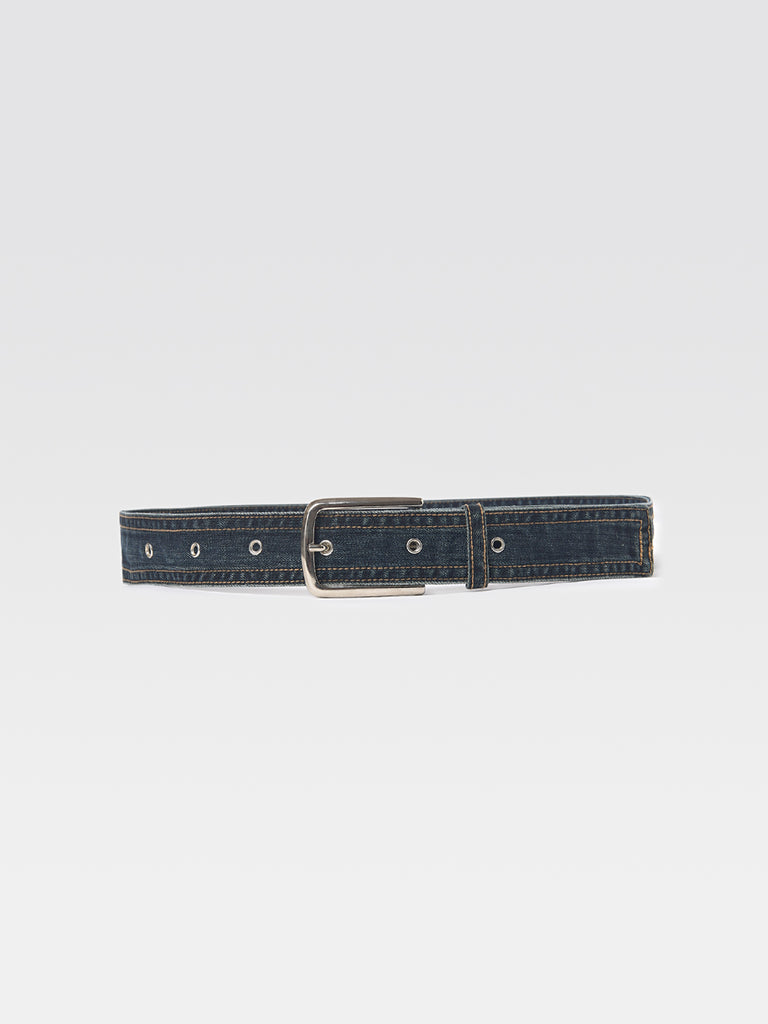 Navy denim belt. Designed with a silver-tone metal buckle and reinforced metallic eyelets. Features a structured silhouette with a washed finish, perfect for women and men.