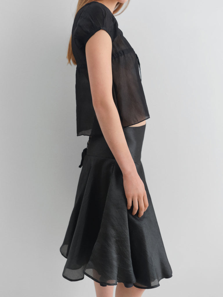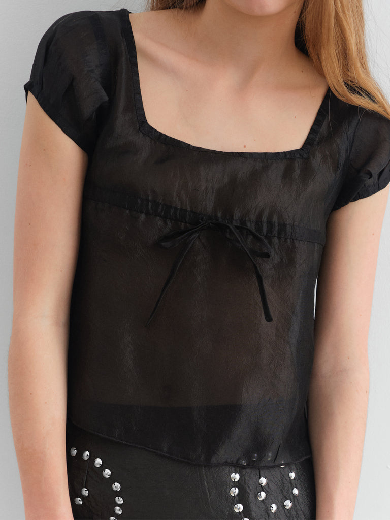Black silk top with square neckline.