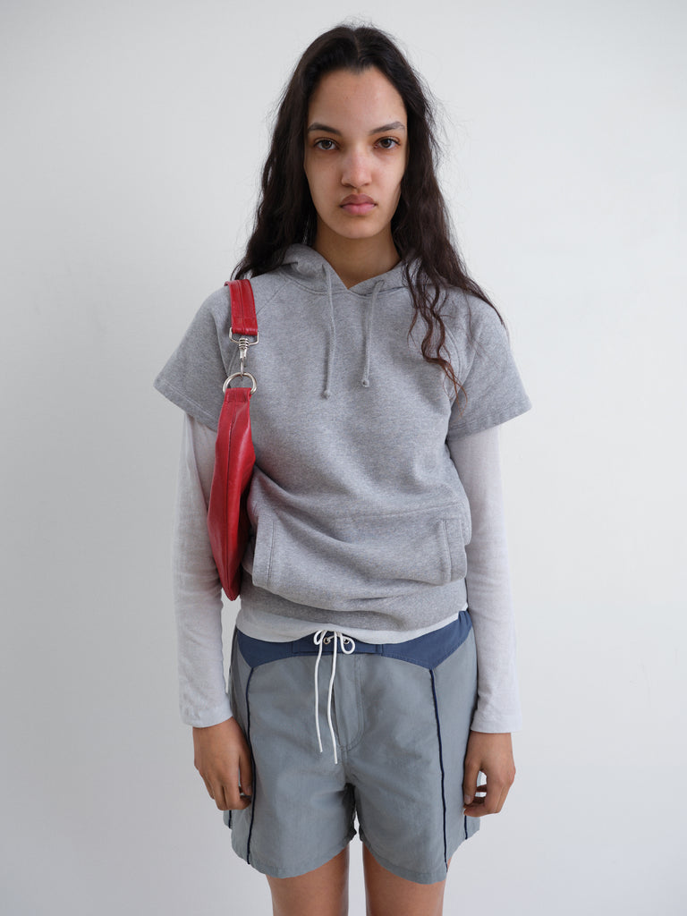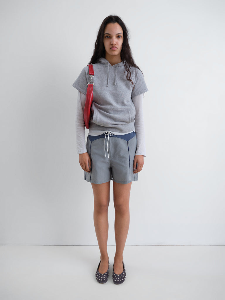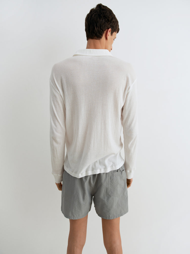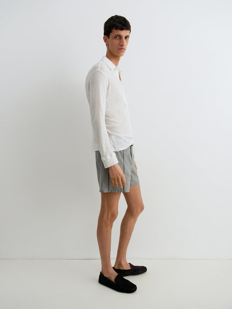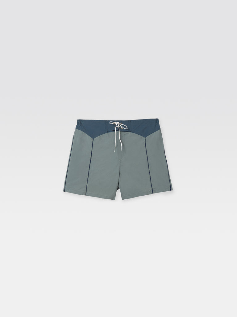 Green men’s swim shorts with contrast piping details. Designed with a structured waistband, back elastic, and x-shaped front closure with a zip and snap button. Features side seam pockets and an inner mesh lining.