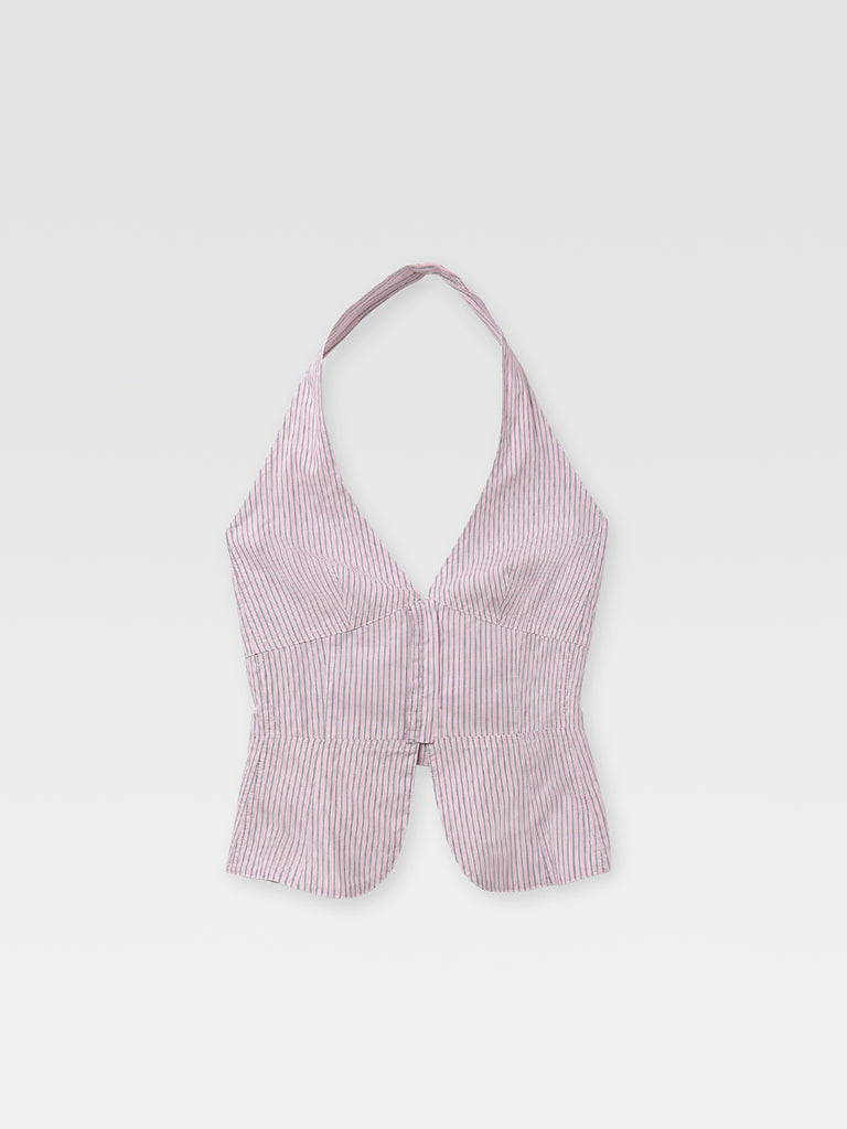 Pink stripes women's fitted halter top. Crafted in lightweight fabric with a deep neckline and an open back. Features concealed front hook fastenings for a seamless look.