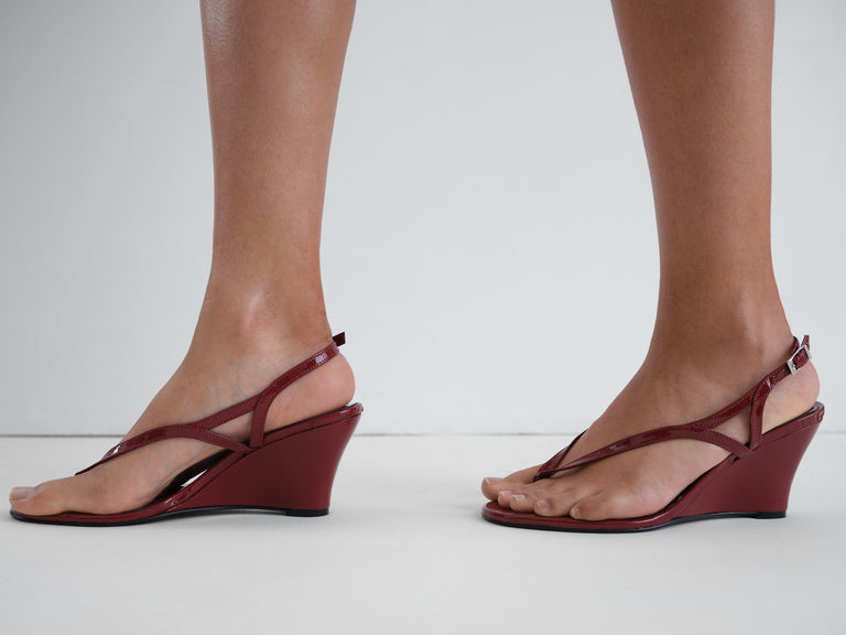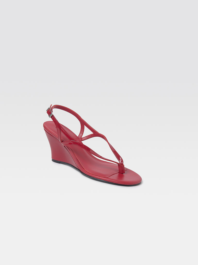 Red patent leather wedge sandals with a glossy finish. Features minimalist straps around the toes and ankle. Women’s silhouette with a 7.5 cm heel. Polished and bold.