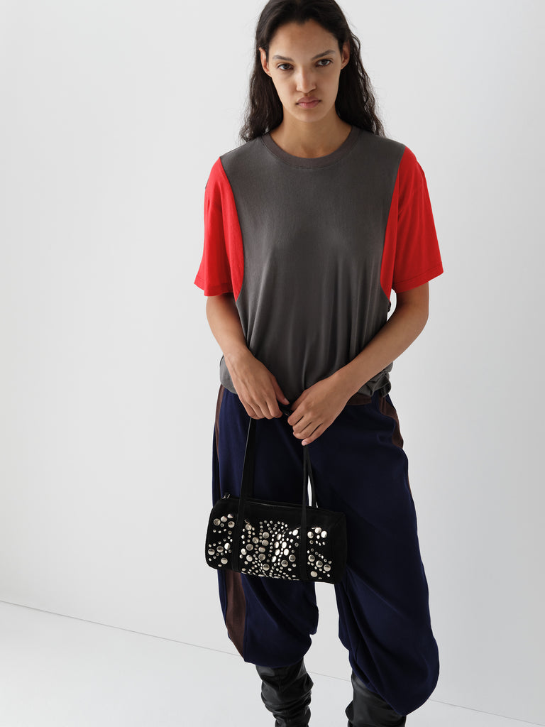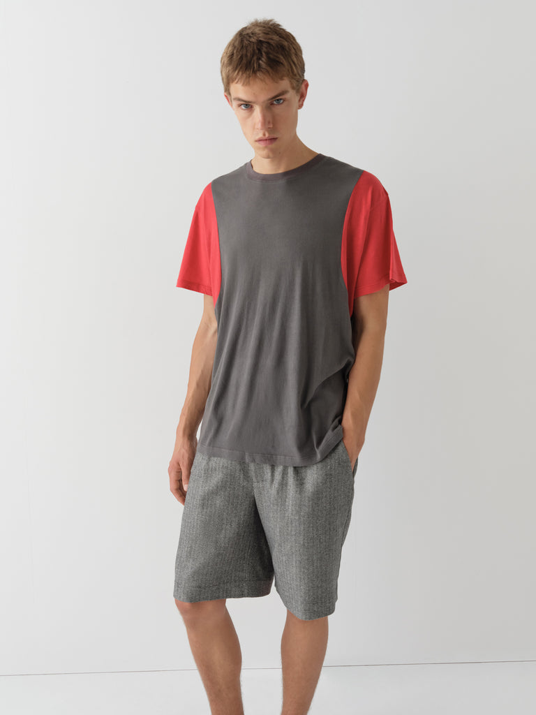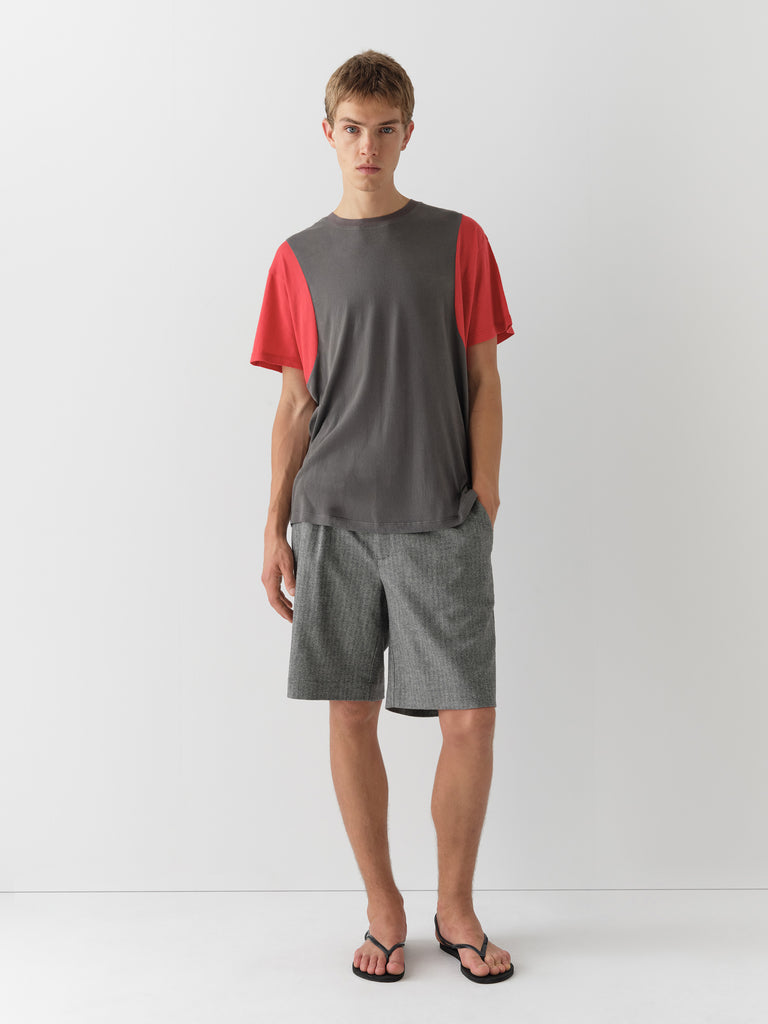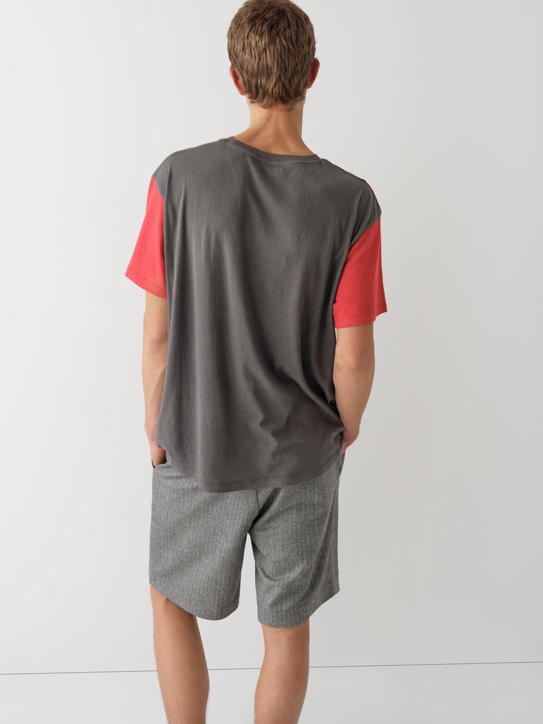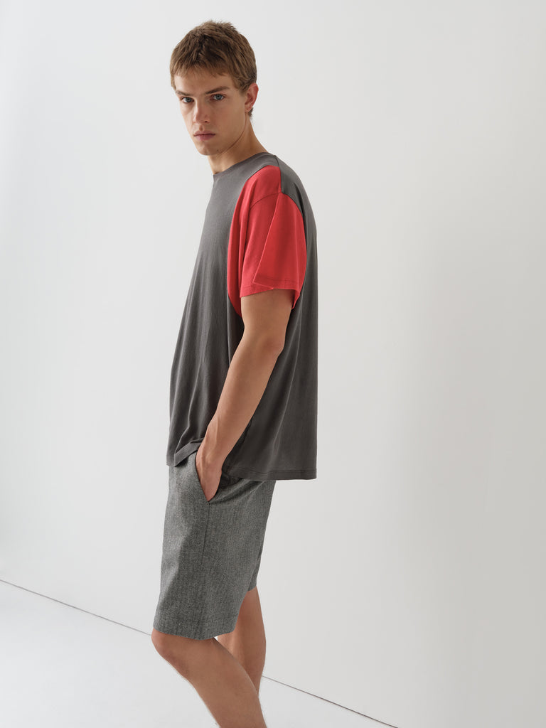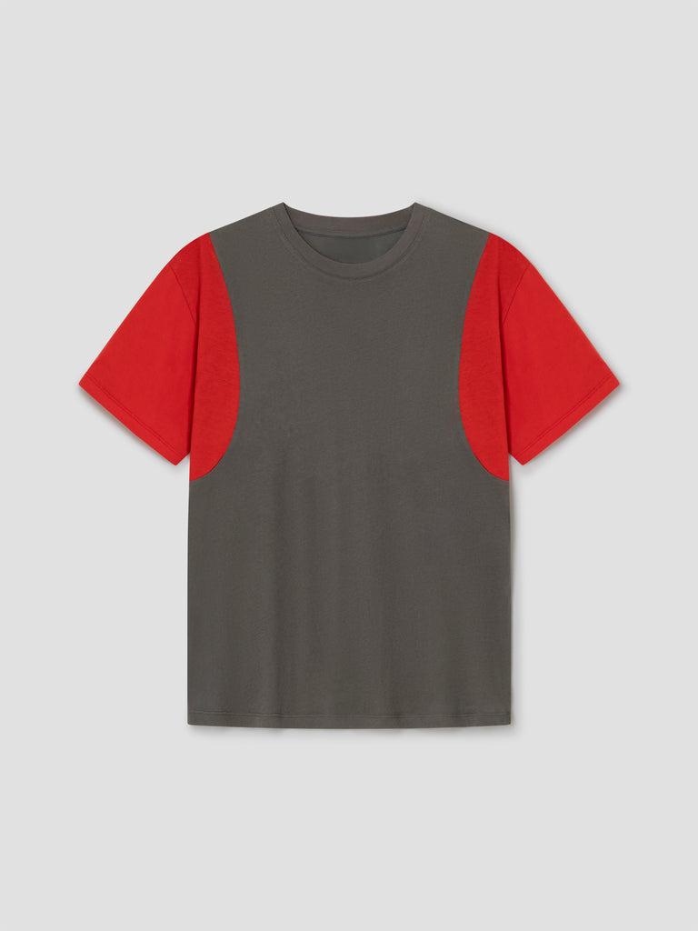 Grey and red t-shirt with curved contrast panels.