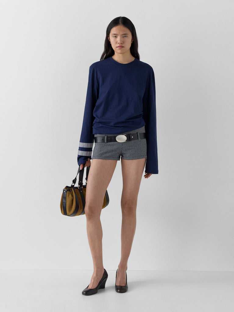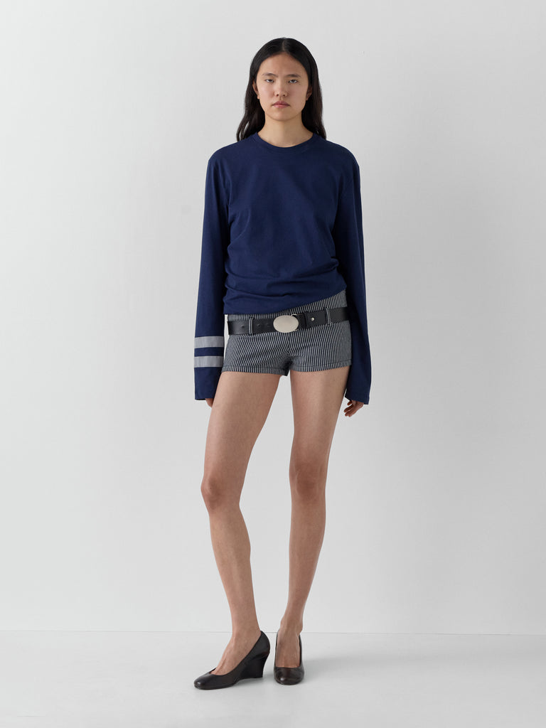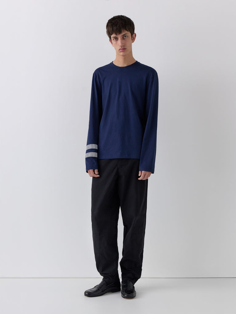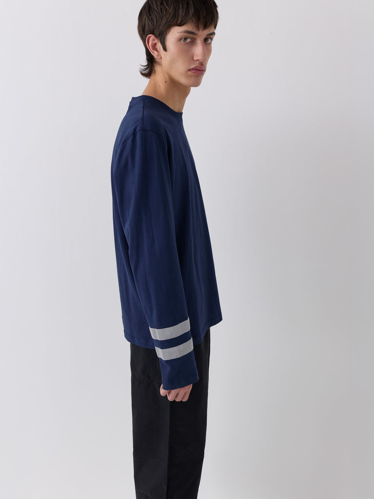 Navy long-sleeve t-shirt with reflective white double stripe.