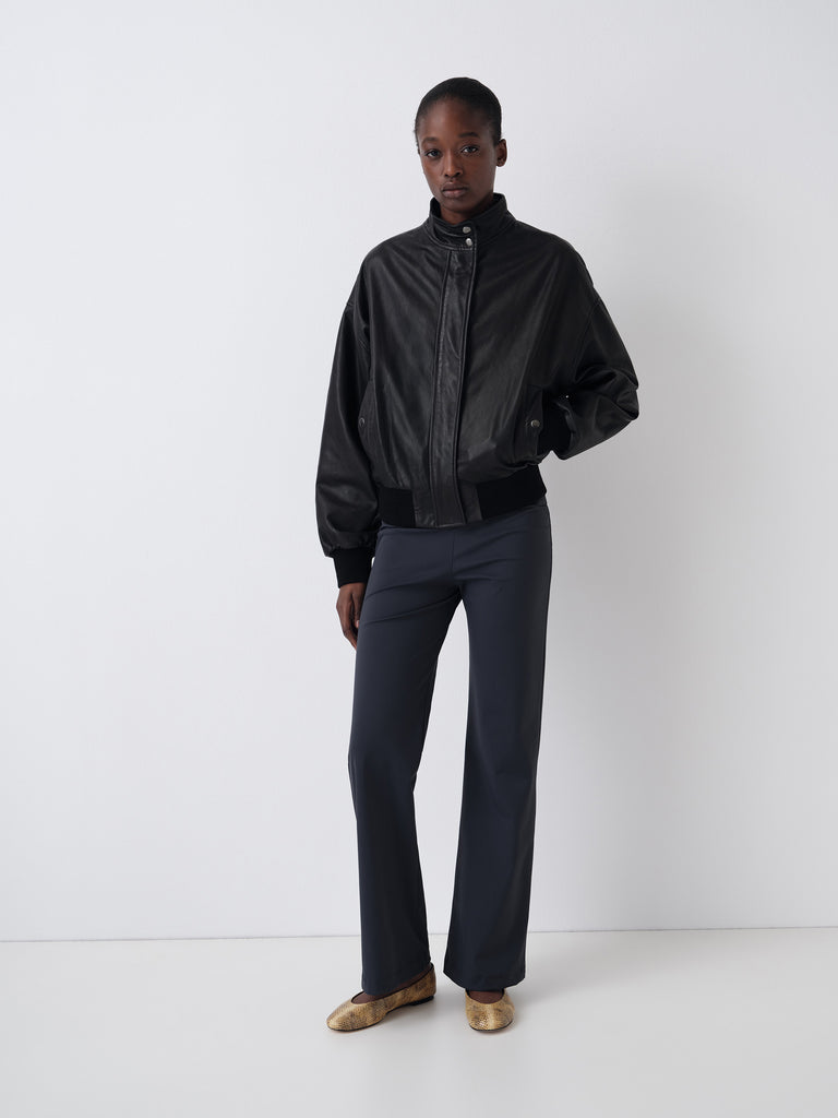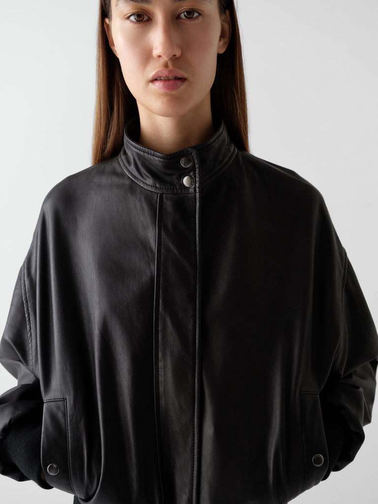 Black leather bomber jacket with mandarin collar and silver hardware.