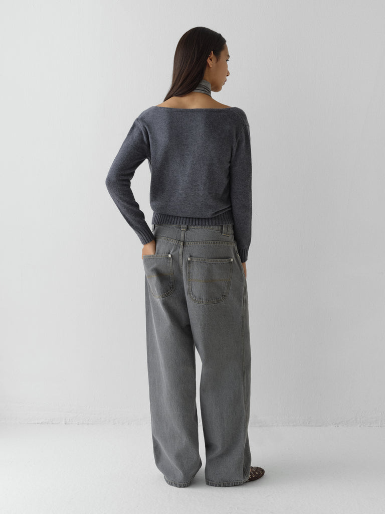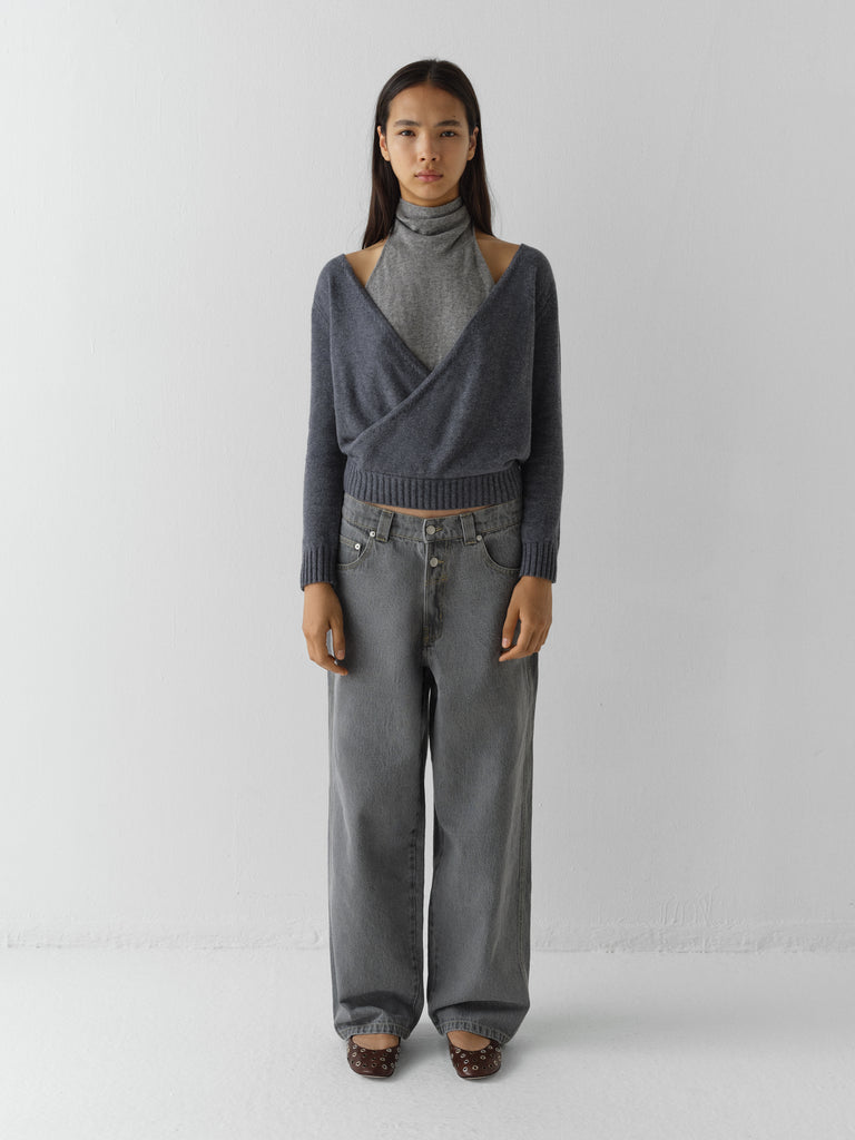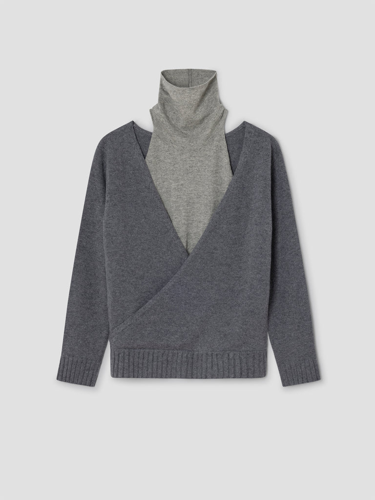 Light grey faux-layered dark grey jumper with cropped shoulders.
