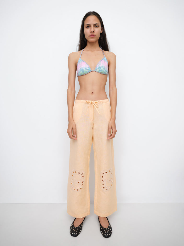 Women’s triangle bikini top in grey and pink plaid. Ties at neck and back with grey straps. Fully lined and finished with matching binding.